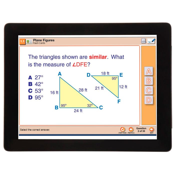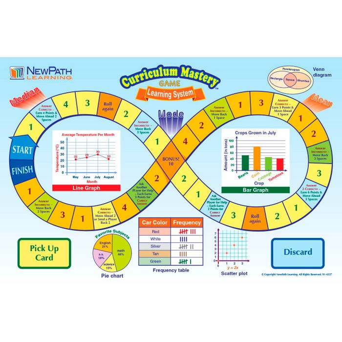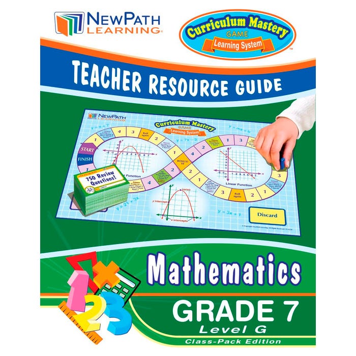 The NewPath Learning Grade 7 Math Curriculum Mastery Take-Home Game is written by teachers using research-based principles and student-tested. The Take-Home Game features 25 individually packaged games, each covering a separate, standards-based topic. Each of the 25 games include a game board, a set of 30 review cards, materials for up to 4 players and instructions for the students/parents – all packaged in a durable vinyl folder, ready to take home! Also includes comprehensive teacher planning/resource guide and a free 1-year Premium Class Online Subscription to access interactive content, activities and assessments. Covers: Organizing Data; Analyzing, Graphing & Displaying Data; Introduction to Algebra; Equations & Inequalities; Using Integers; Rational & Irrational Numbers; Decimal Operations; Exponents, Factors & Fractions; Fraction Operations; Numerical Proportions; Geometric Proportions; Introduction to Percent; Applying Percents; Plane Figures: Lines & Angles; Plane Figures: Closed Figure Relationships; Measurement, Perimeter & Circumference; Exploring Area & Surface Area; The Pythagorean Theorem; Finding Volume; Introduction to Probability; Using Probability; Algebraic Equations; Algebraic Inequalities; Introduction to Functions; Nonlinear Functions & Set Theory.Features