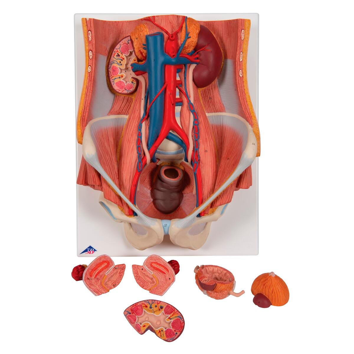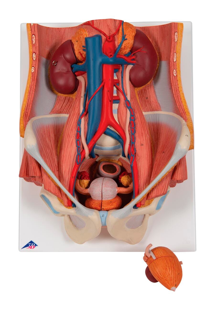 American 3B Scientific Dual Sex Urinary System Model details the structures of retroperitoneal cavity, large and small pelvis with bones and muscles, inferior vena cava, aorta with its branches including iliacal vessels, upper urinary tract, rectum, and the kidney with adrenal gland.