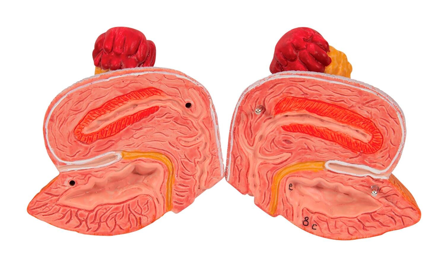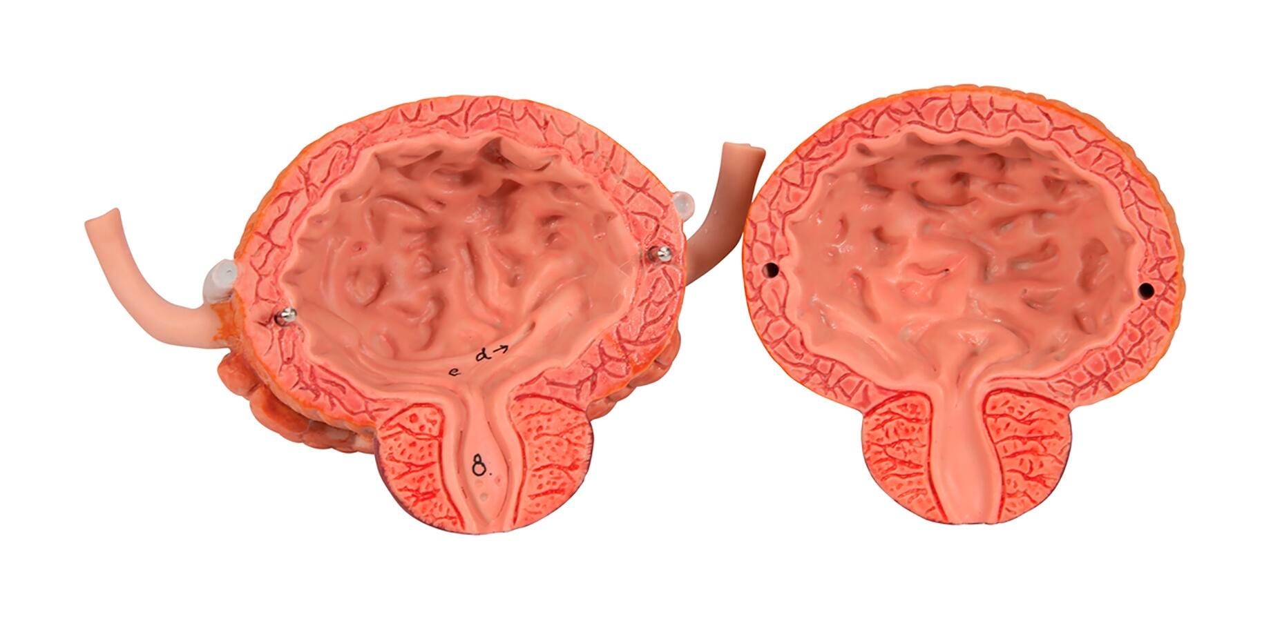 One front half of a kidney is removable from the anatomical model of the urinary system. With easy to change male insert (bladder and prostate, front and rear half) and female insert (bladder, womb and ovaries, 2 lateral halves) the Urinary System model is a great teaching tool. Parts are numbered on the Dual Sex Urinary System.