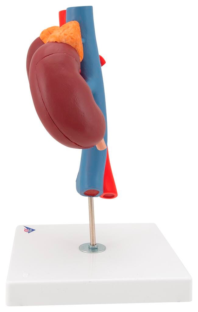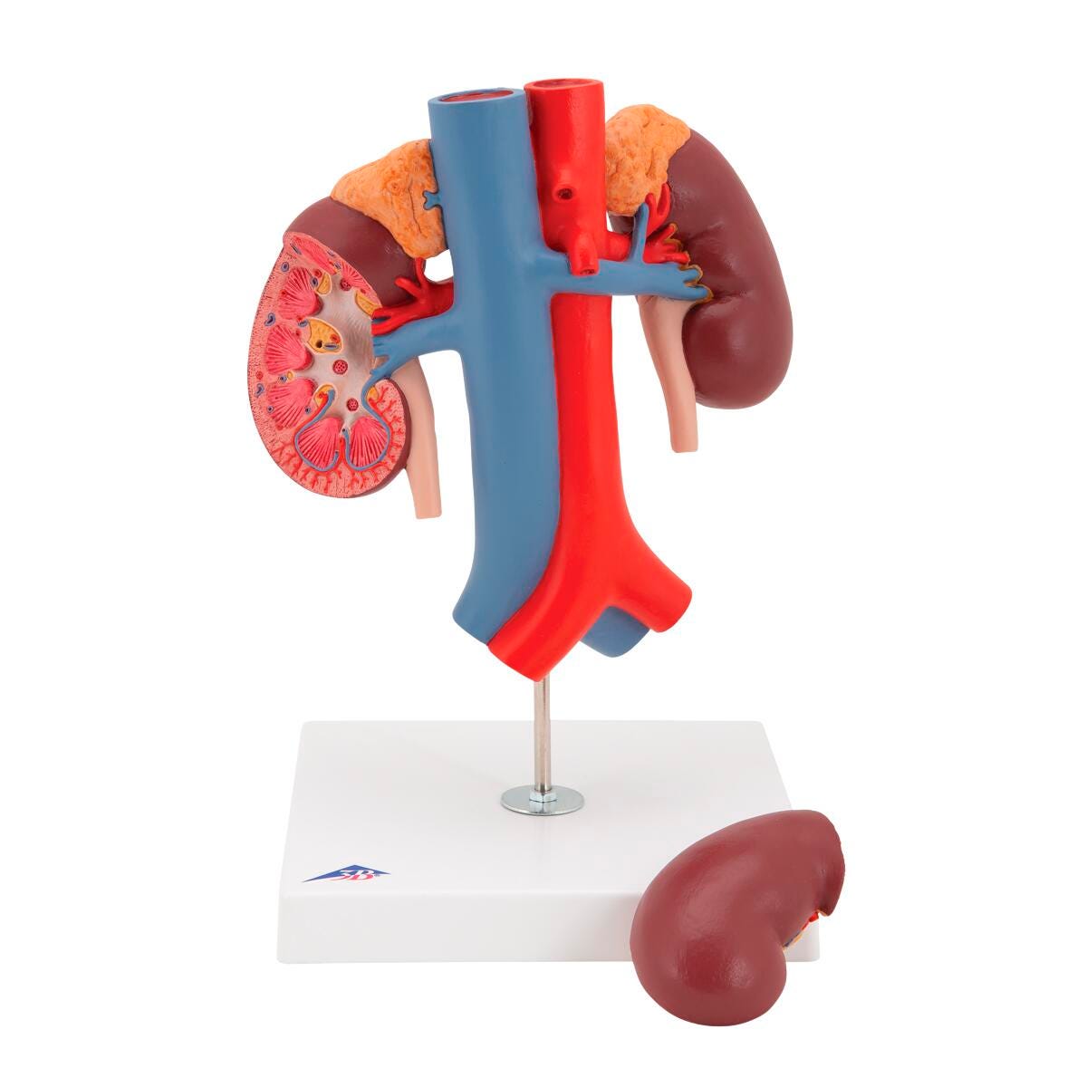 American 3B Scientific Human Kidneys Model with Vessels is a 2-part model that shows kidneys with suprarenal glands, the outgoing ureters, the renal vessels and the large vessels situated close to the kidneys in natural size. The front half of the right kidney can be removed to reveal the renal pelvis, the renal calices, the renal cortex and the renal medulla of the human kidney. This high quality model is a great tool for demonstrating the anatomy of the human kidney.