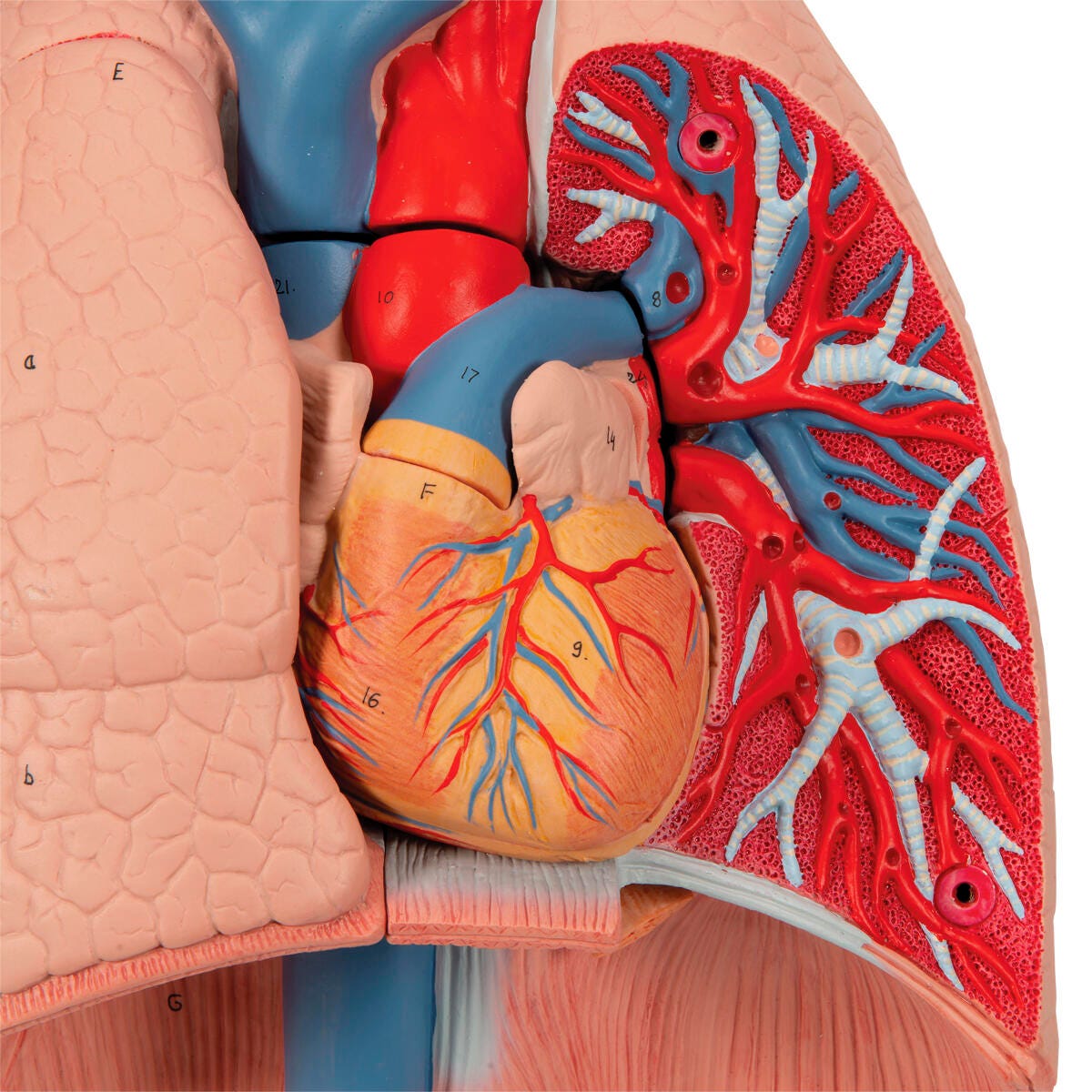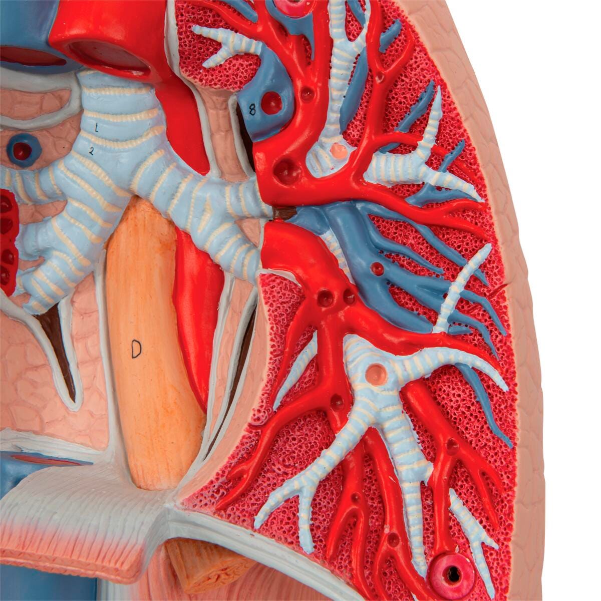 American 3B Scientific Life Size Lung Model with Larynx is a 7-part model that features removable parts such as the 2-part larynx, trachea with bronchial tree, 2-part heart, subclavian artery and vein, vena cava, aorta, pulmonary artery, esophagus, 2-part lung, and diaphragm.