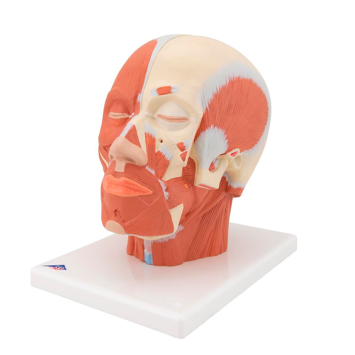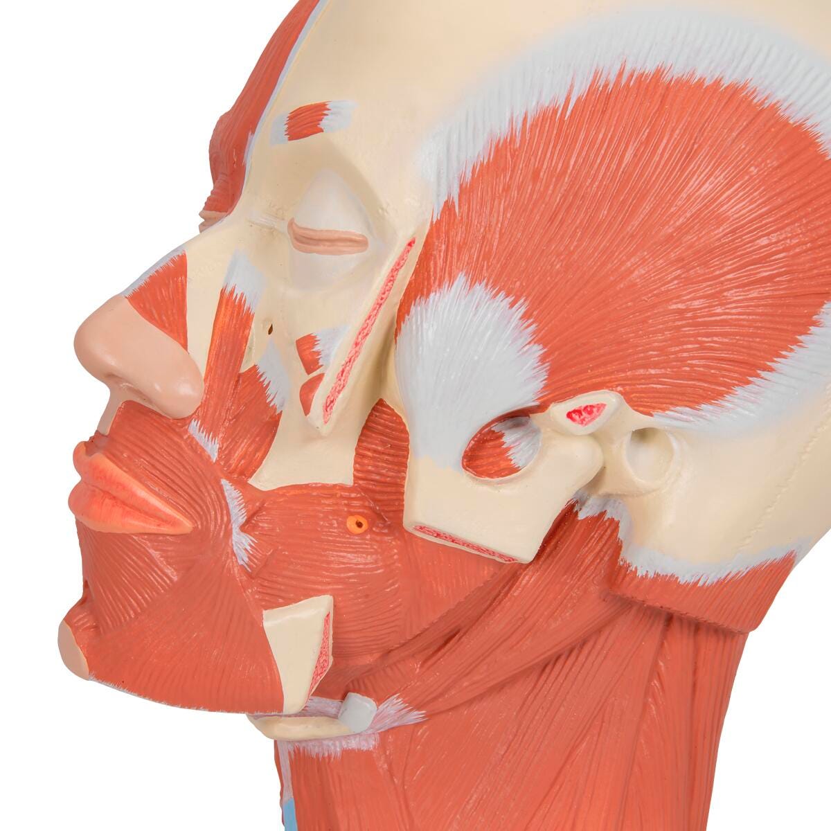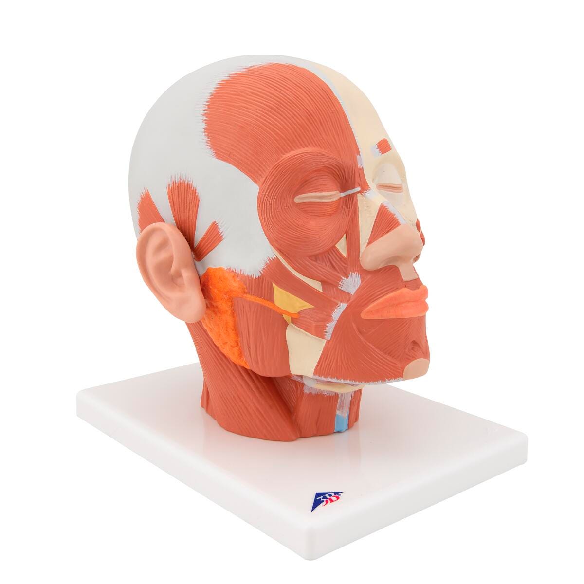 American 3B Scientific Head Musculature model represents the superficial musculature of the head that shows the parotid gland, submandibular gland (right half), deep musculature (left half), and the lower jaw partially exposed.
