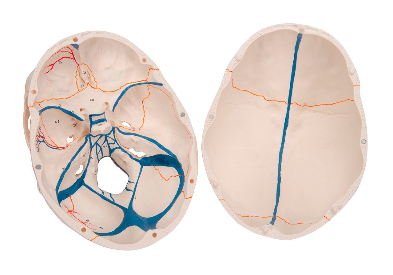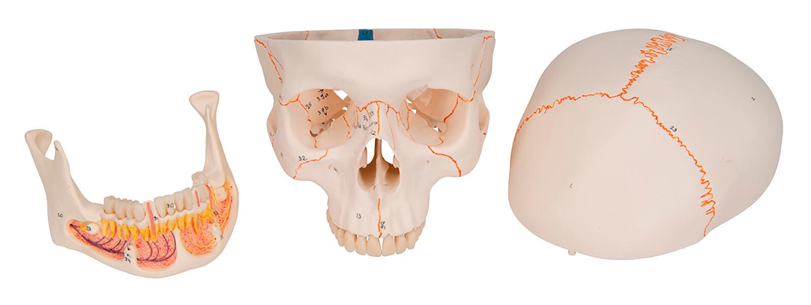 American 3B Scientific Skull with Opened Lower Jaw model exposes tooth roots with vessels and nerves. The skull model also features the numbering of the cranial bones, bone components, fissures, foramina and other structures. The cranial sutures are shown in color, as are the meningeal vessels and venous sinuses.