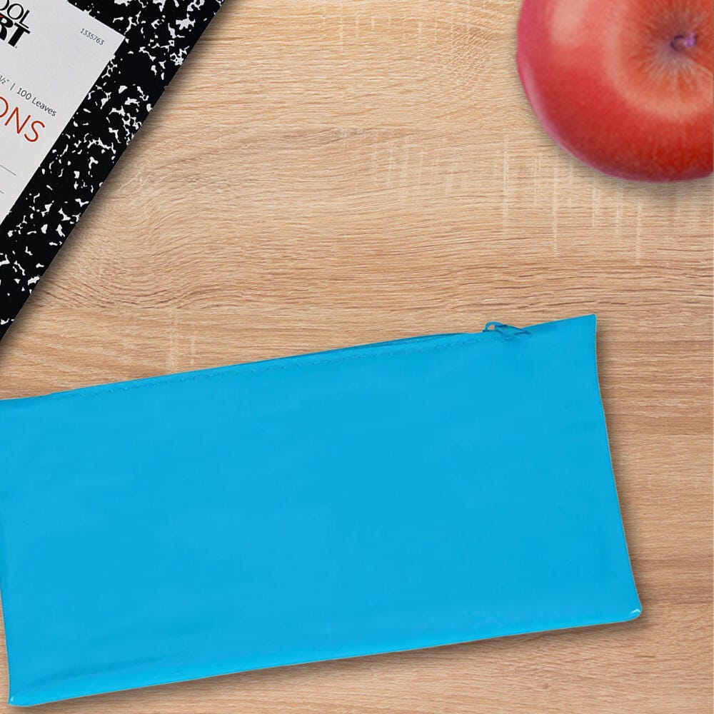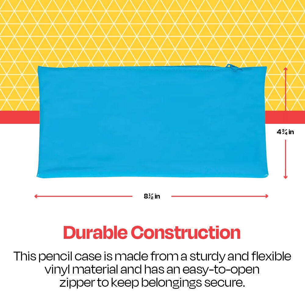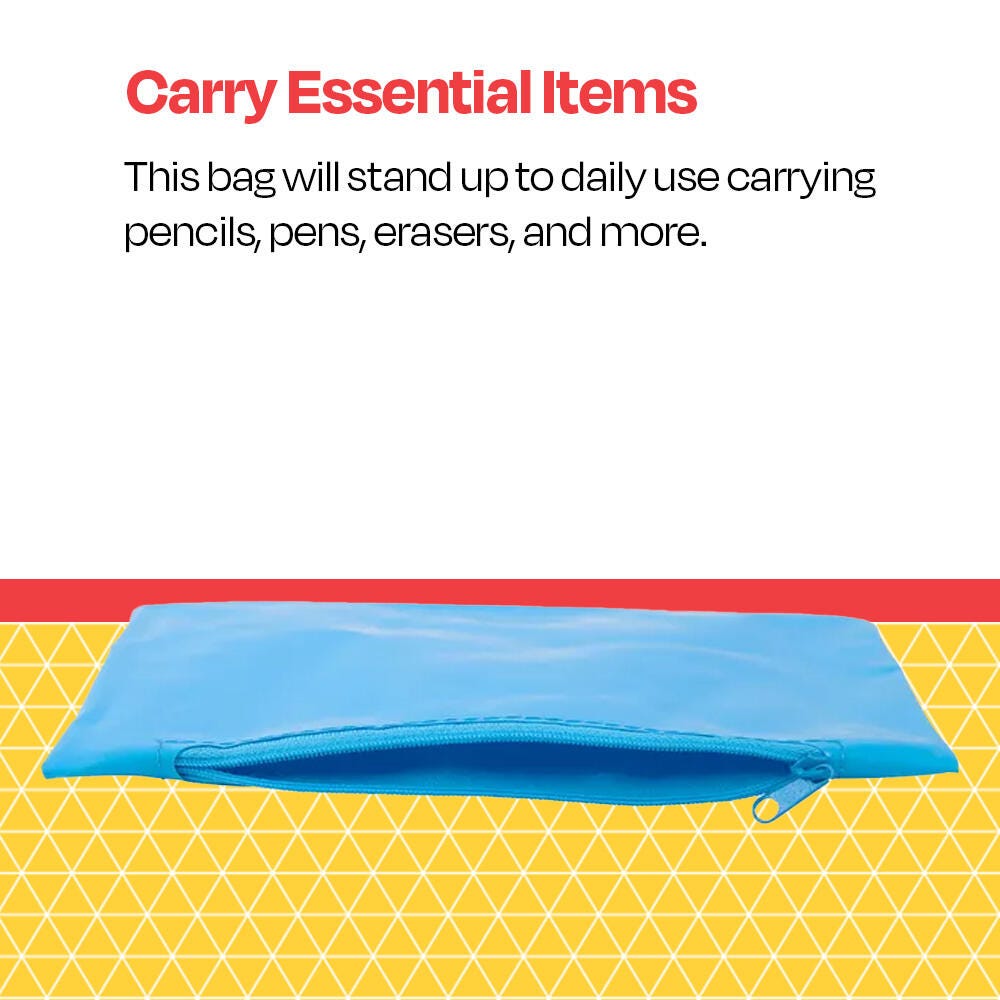 Made of soft vinyl material to flex and fit a variety of supplies, this School Smart pencil case helps you keep your pens, pencils, and erasers all in one spot. The pencil bag’s sturdy metal zipper keeps everything snug and secure inside. Use at school, in the office, or on the go. The vinyl pouch is great for kids, teens, and adults.