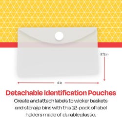 Organize your classroom, closet, or pantry with the School Smart basket tags label holder. The clear plastic ID pouch is compatible with the following wicker basket item numbers: 1435067, 1435090, and 1435091. This multi-pack includes 12 label holders for naming different bins, each detachable clear label case includes a snap closure that attaches to the basket.Features