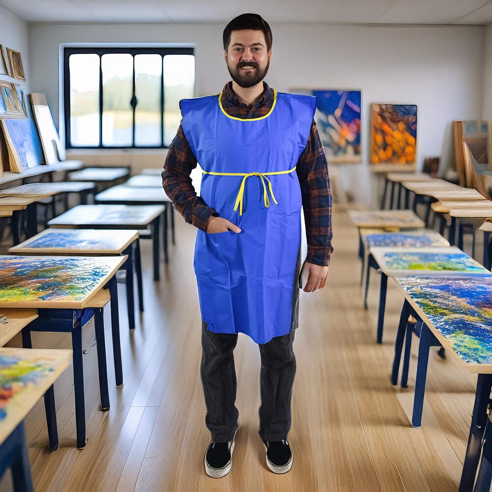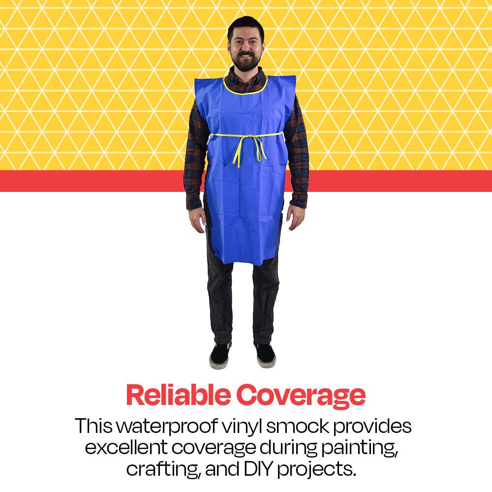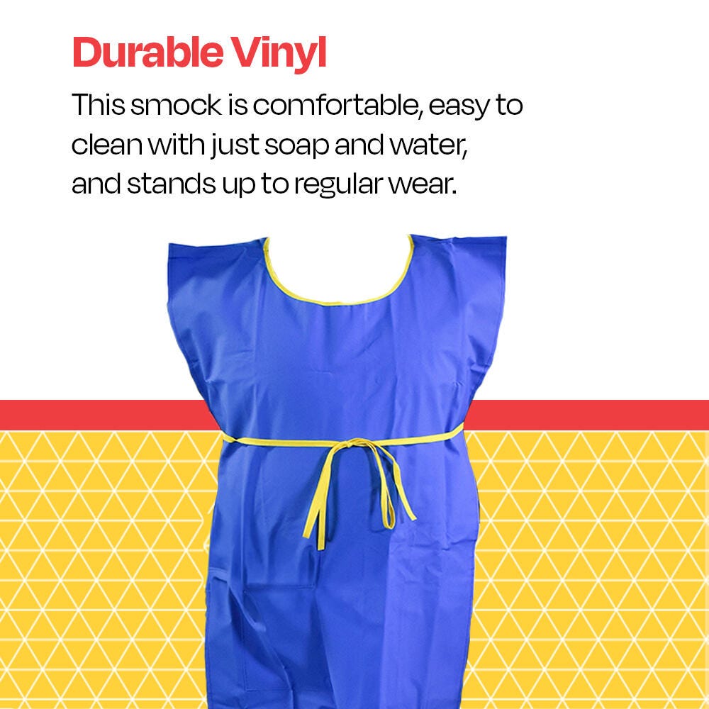 The School Smart adult art apron is made of easy-to-clean, washable and waterproof vinyl. This apron is durable, comfortable, and fire-retardant. The easy-to-clean adult smock also features a colorful design and one pocket for convenient storage. This smock is perfect for classroom art projects, science activities or school art room use.