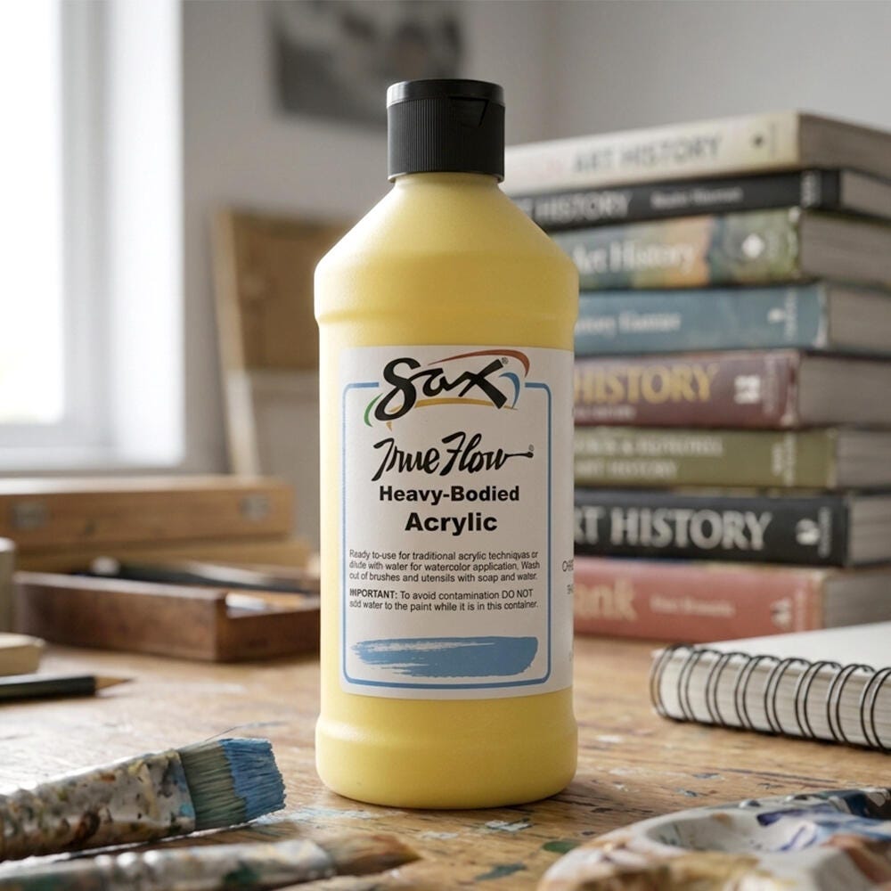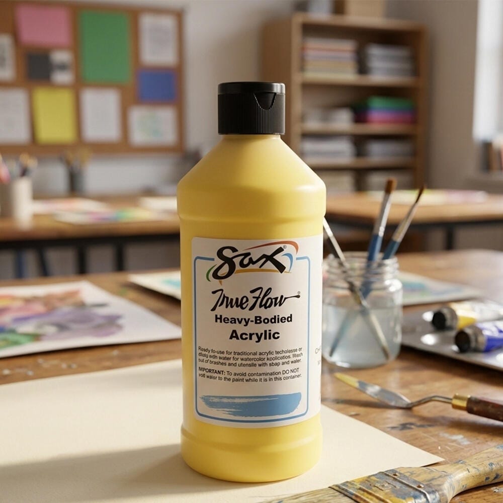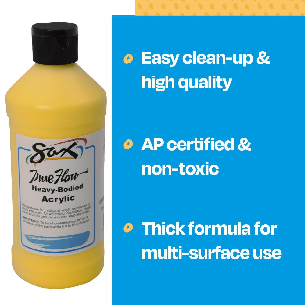 This Sax heavy body acrylic paint in a chrome yellow color comes in a convenient 1 pint bottle to accommodate the classroom. Non-separating and intermixable for a range of hues, our art paint is easy to apply. This paint dries to a matte finish and is ideal for traditional acrylic painting as well as block printing or silk screening. Enjoy excellent flow, coverage, blending, and drying for a variety of projects. Use the classroom paint for school assignments, art classes, group painting, or background canvas painting. Each acrylic paint comes in a durable plastic container for convenient handling and storage. Not recommended for outdoor use.