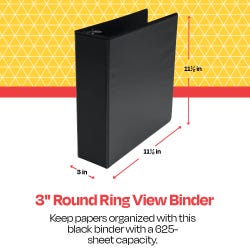 Gather records, paperwork, notes, and other essential papers with the School Smart black 3 inch round ring view binder. Our durable O ring binder with view pockets has a useful non-glare overlay on the front, back, and spine covers to allow you to insert custom labels or individual sheets for easy viewability and access. Cover pockets on the large clear view binder also prevent the transfer of ink from printed materials. The O ring mechanisms are O-shaped and easy to open and close, so you can organize and store important sheets of paper in your 3 ring view binder. Made of polypropylene, the sturdy binder also has two deep inner pockets to hold loose sheets of paper. This O ring file has a 625 sheet capacity, and the entire black binder measures 11-1/2 x 11-1/2 inches.Features