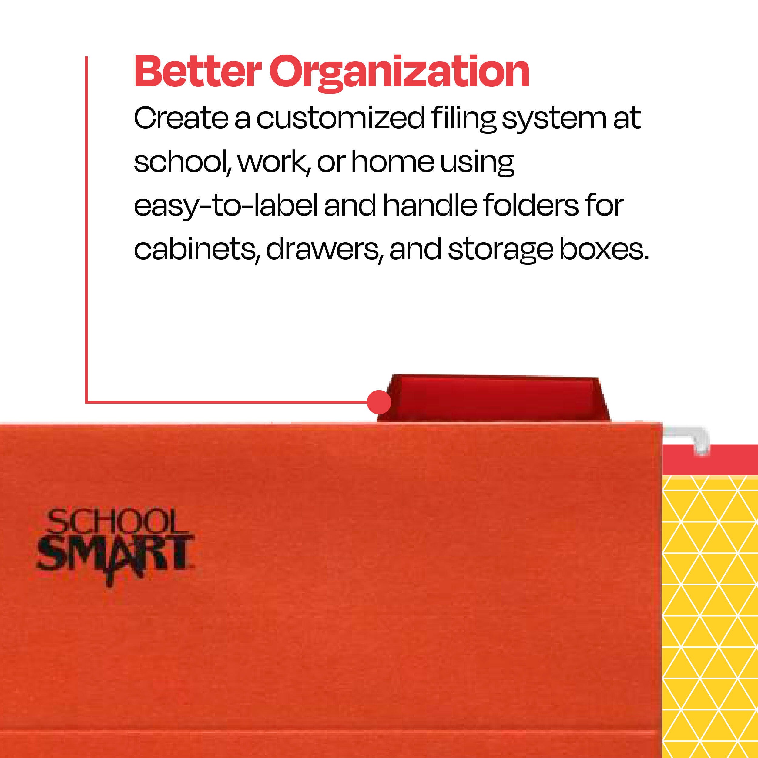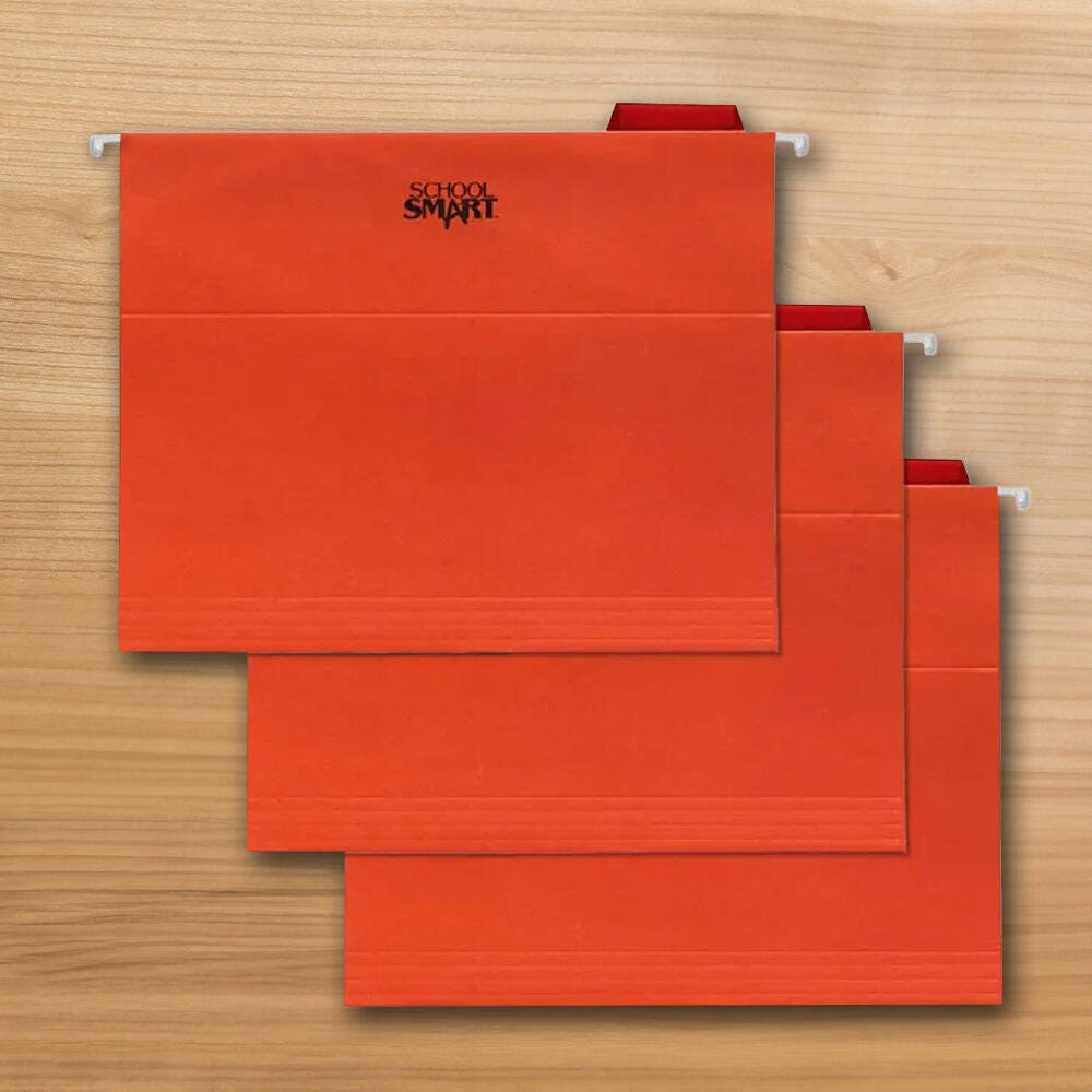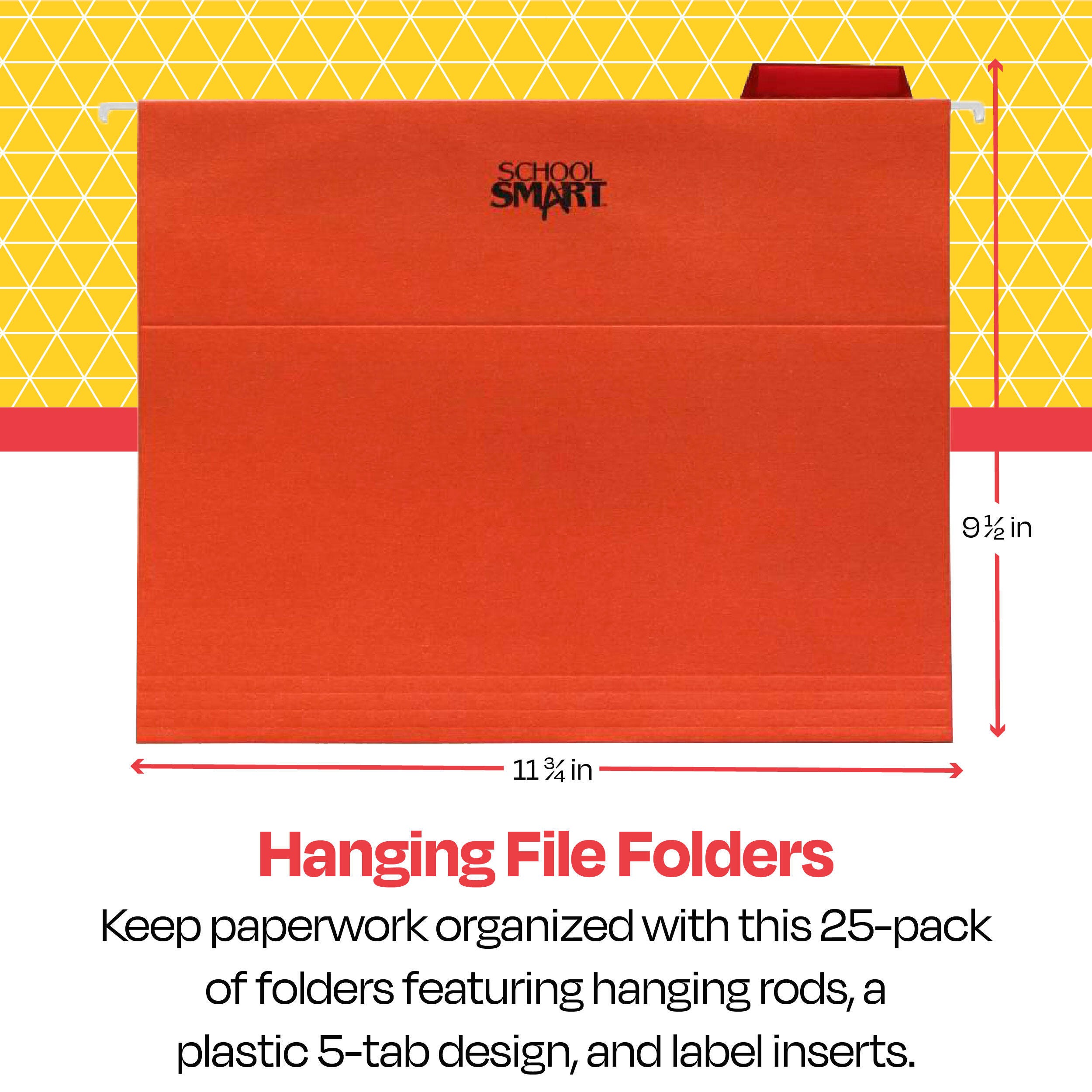 This School Smart hanging file folders letter size set has 5 clear top tabs. The red folders are made of smooth, medium weight stock for long-lasting use in the classroom or office. A sturdy design helps store important paperwork in a vertical file, while the two tones help you identify files quickly and easily. Each reinforced hanging folder has coated hangers for smooth sliding in file cabinets, desk drawers, and storage boxes. Create custom labels with blank inserts and 1/5 cut clear tabs to create your best organization system for letter sized papers.