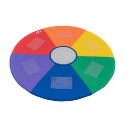 Spark curiosity for the developing baby. Each of the 6 different colored panels have a clear 4 x 6 pocket for inserting pictures of family members or favorite objects. The center is a 9-1/2-inch flexible mirror that attracts inquisitive babies to look in and see themselves. Mat measures 36 x 36 inches and is 1 inch thick.Features