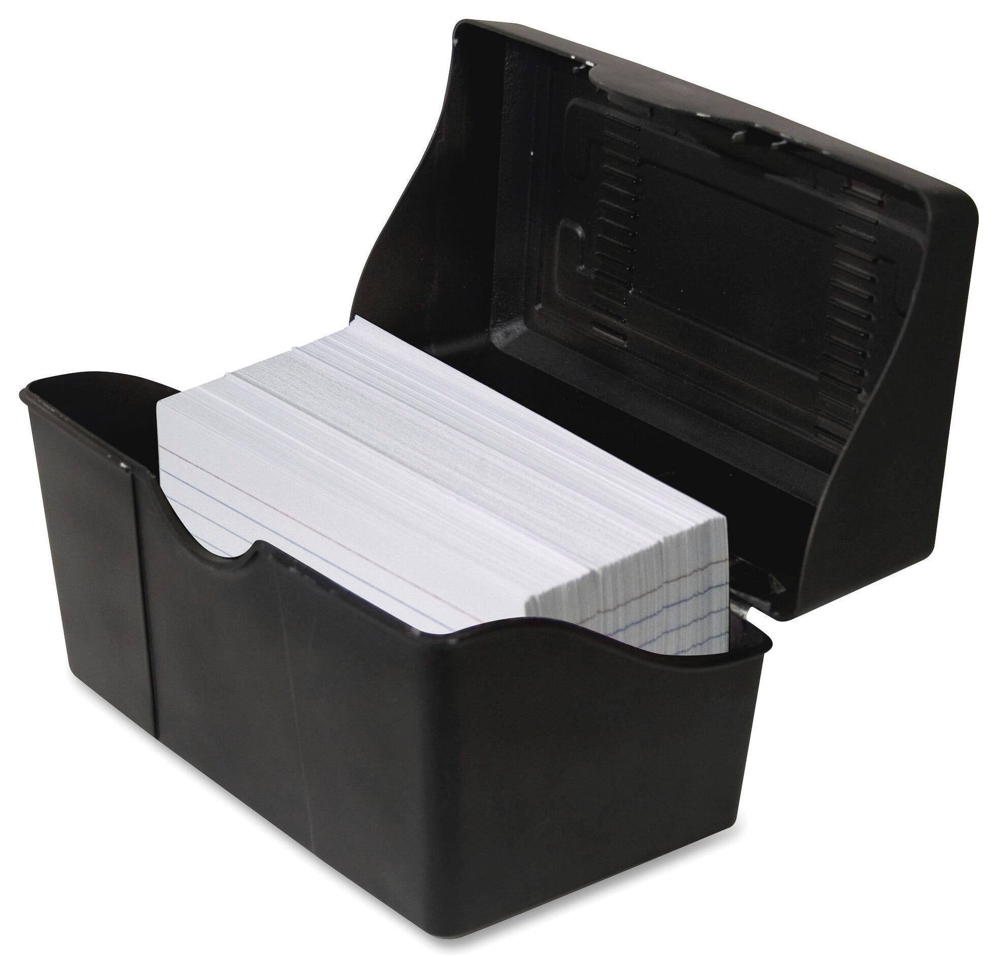 Advantus Black Index Card Box measuring 3 x 5 inches is made from durable plastic and comes with a snap lid.Features