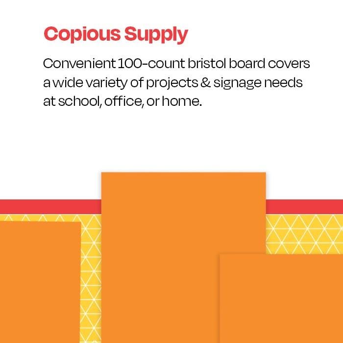 Whether creating a masterpiece or a prize-winning presentation, School Smart has got you covered! Our medium-weight, orange bristol board has excellent folding quality with clean creases for making signs, posters, and a variety of construction craft work. Each board is made of 100 percent sulphite with 100 lb. weight basis that keeps your designs clean, smear- and blot-free, while great for mixed media to capture any idea!