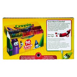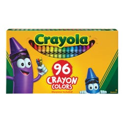 This box of Crayola Crayons delivers vibrant colors that will brighten any drawing, coloring book, or arts and crafts project! A classic art tool that students and teachers love, these crayons are designed to provide hours of colorful fun, with bold and true color, a smooth formula, and a durable construction. This set contains 96 crayons in an assortment of colors and comes in a handy storage box with a built-in crayon sharpener.Features