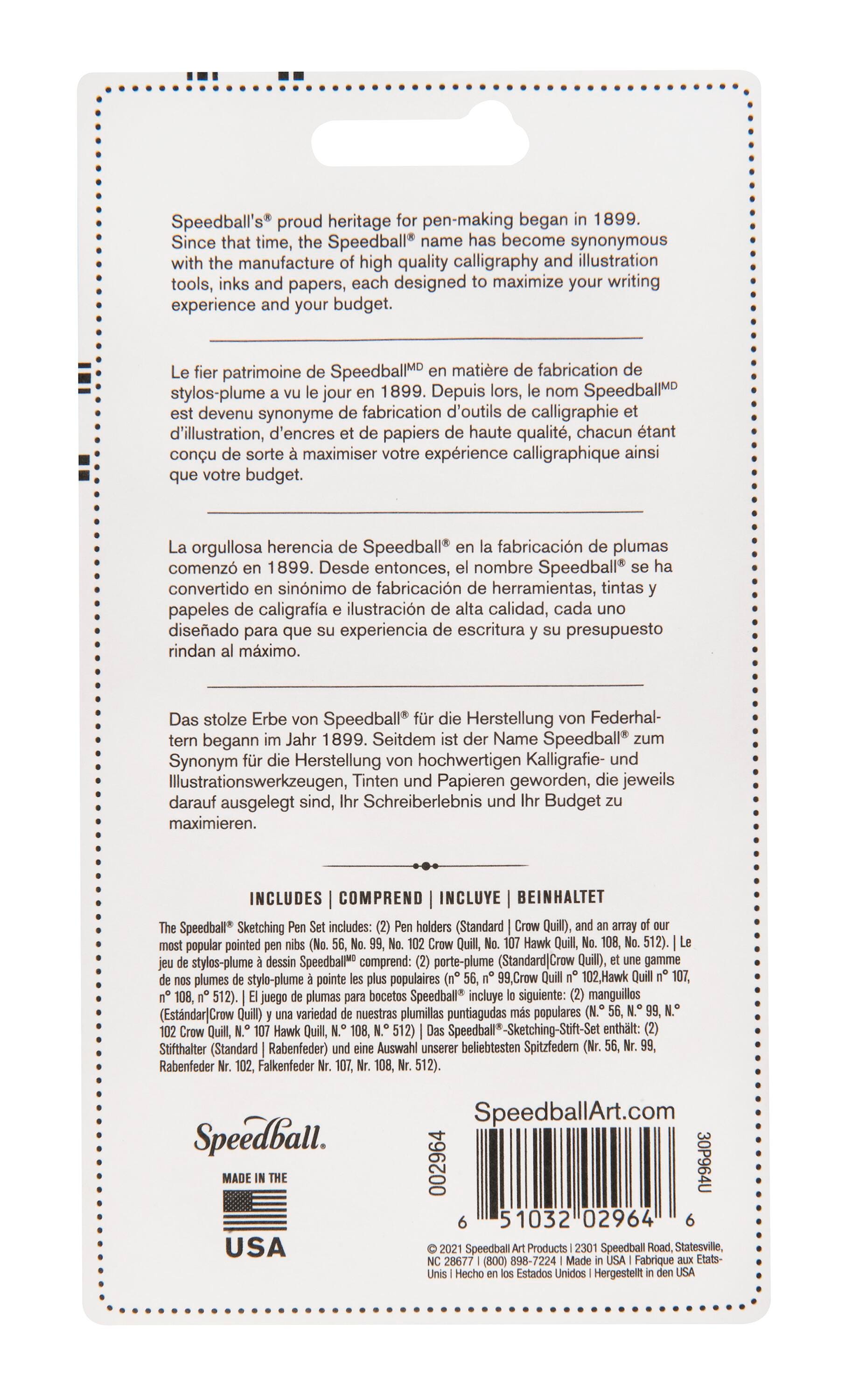 Speedball Sketching Set perfect for drawing, sketching, lithography, lettering and crosshatching contains 2 penholders and 5 pens. Speedball penholder is designed for school pen/56, drawing pen/99, bowl-point pen/512 and crow quill penholder is designed for crow quill pen/102 and hawk quill pen/107. Sold per set.Features