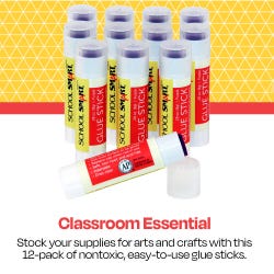 This pack of quality glue sticks from School Smart offers simple bonding for beginners or experienced crafters! They have a screw and twist-up applicator to bond desired pieces such as paper, photos, fabric, cardboard, and more. The purple glue conveniently applies purple and dries to a clear, non-visible translucent color. It is nontoxic, acid-free, gluten-free, photo-safe, and has a long shelf life that lasts up to 2 years. Not recommended for children under 3 years old. Sold as a pack of 12. AP certified by ACMI.Features