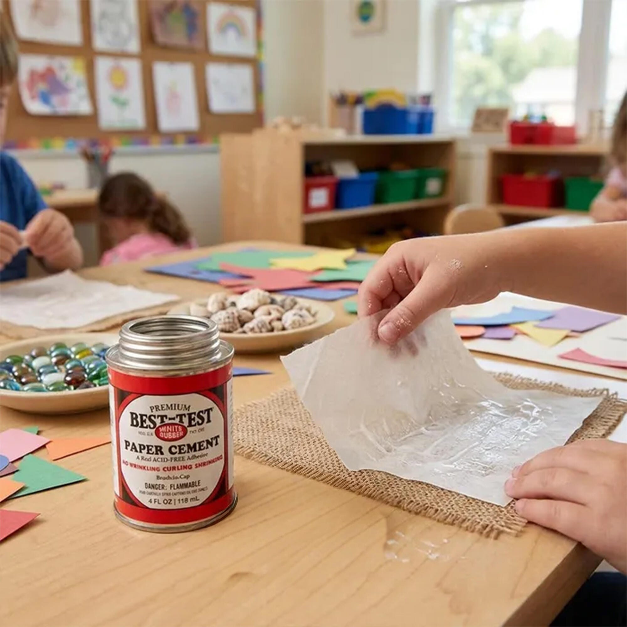 Premium rubber cement made with a specially-blended and treated formula which uses pure natural white rubber. Does not shrink or wrinkle paper when adhering.