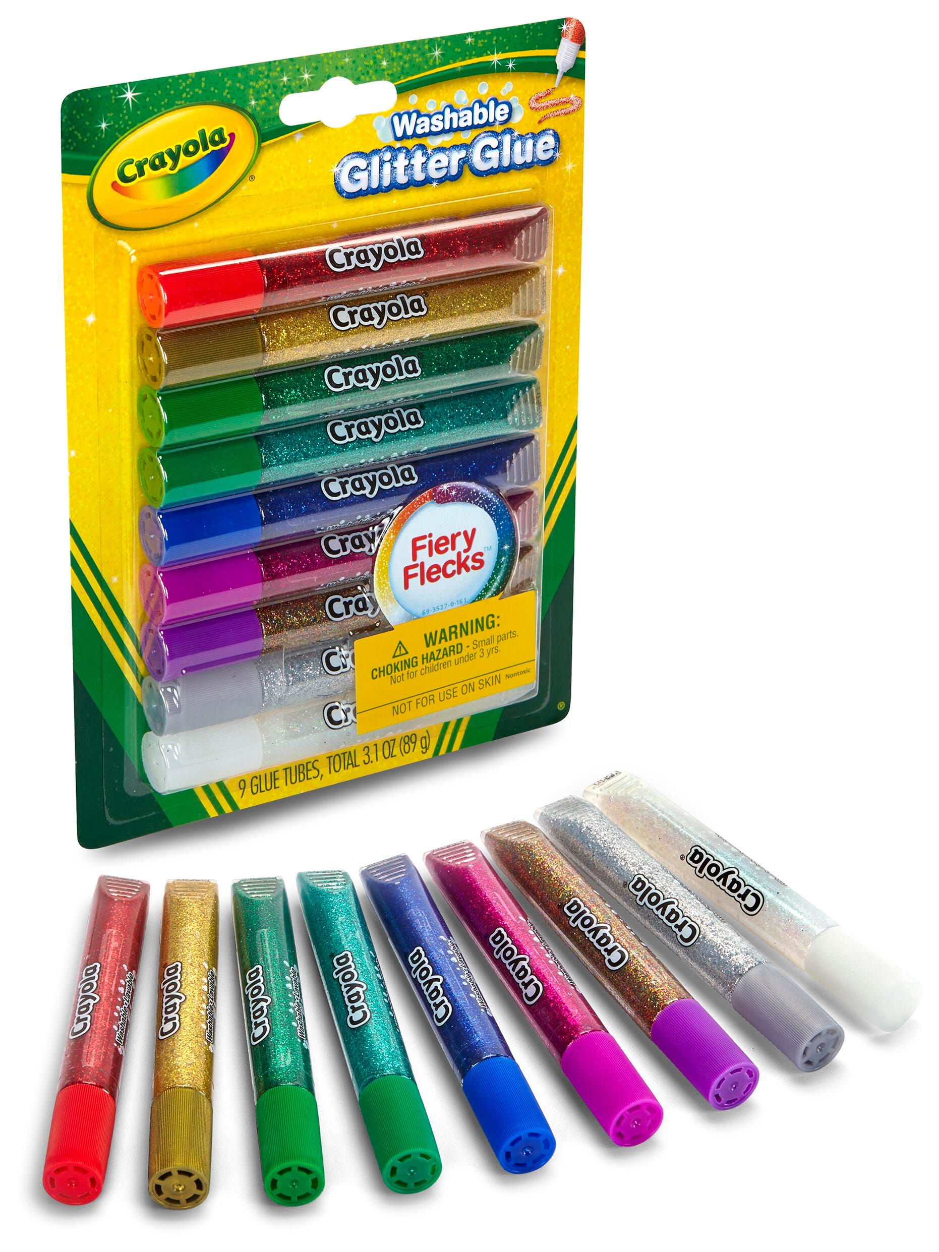 Crayola Glitter Glue squeezes out easily and dries in 30 minutes, so kids can make their artwork shimmer anytime. Washable Glitter Glue rinses off from skin and most machine-washable clothing. Non-Toxic. Sold as a pack of 9 assorted colors. Each tube is 0.35 ounces.Features