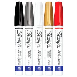 This set of Sharpie Oil-Based Paint Markers inspires you to create in vivid colors. The markers feature a durable medium tip that leaves bold, opaque marks that stand out on any surface. The quality oil-based paint is specially formulated to last and resists abrasions, water, and fading. Bring any creative project to life with these colorful paint markers. This set of 5 paint markers includes the following colors: black, white, red, silver, and gold.Features