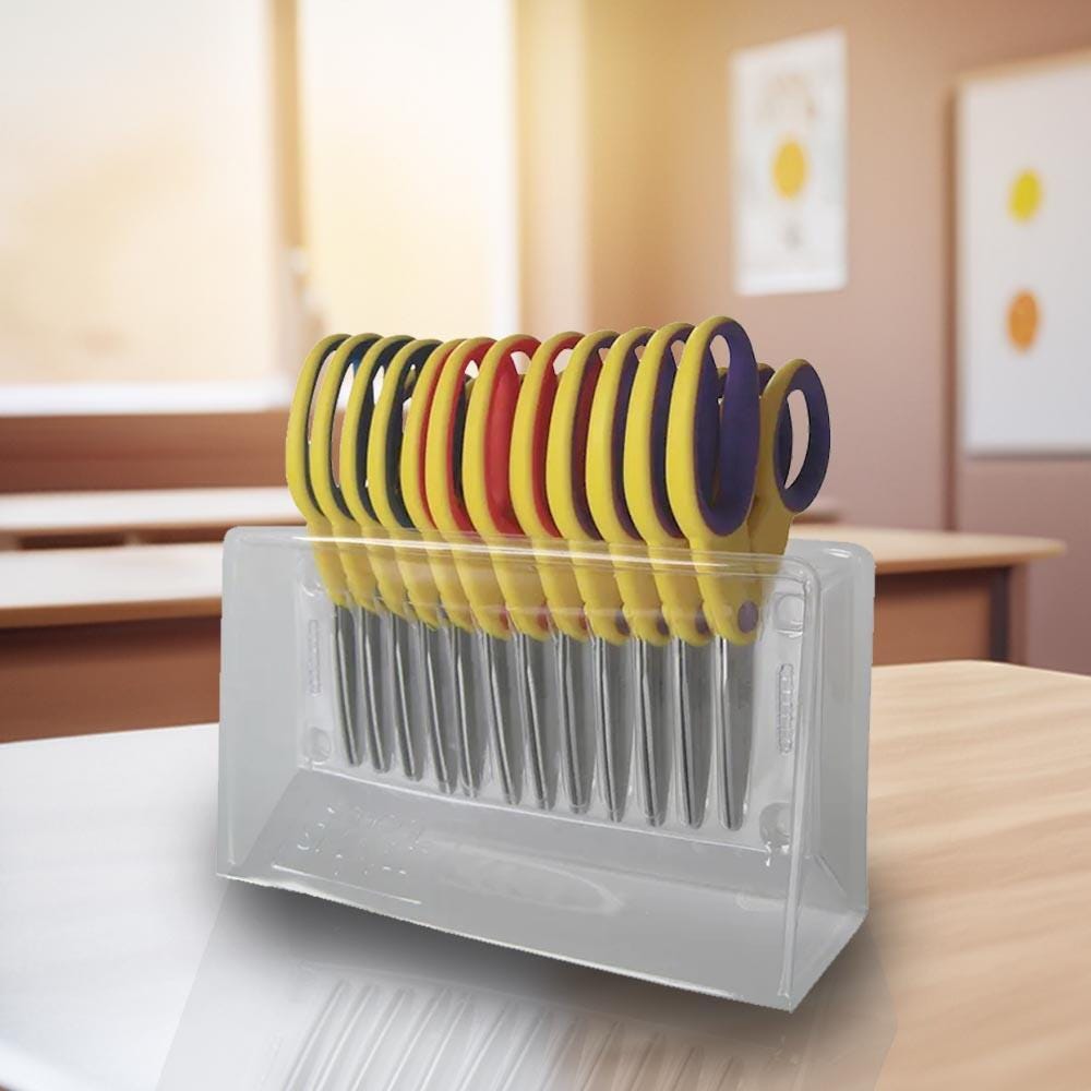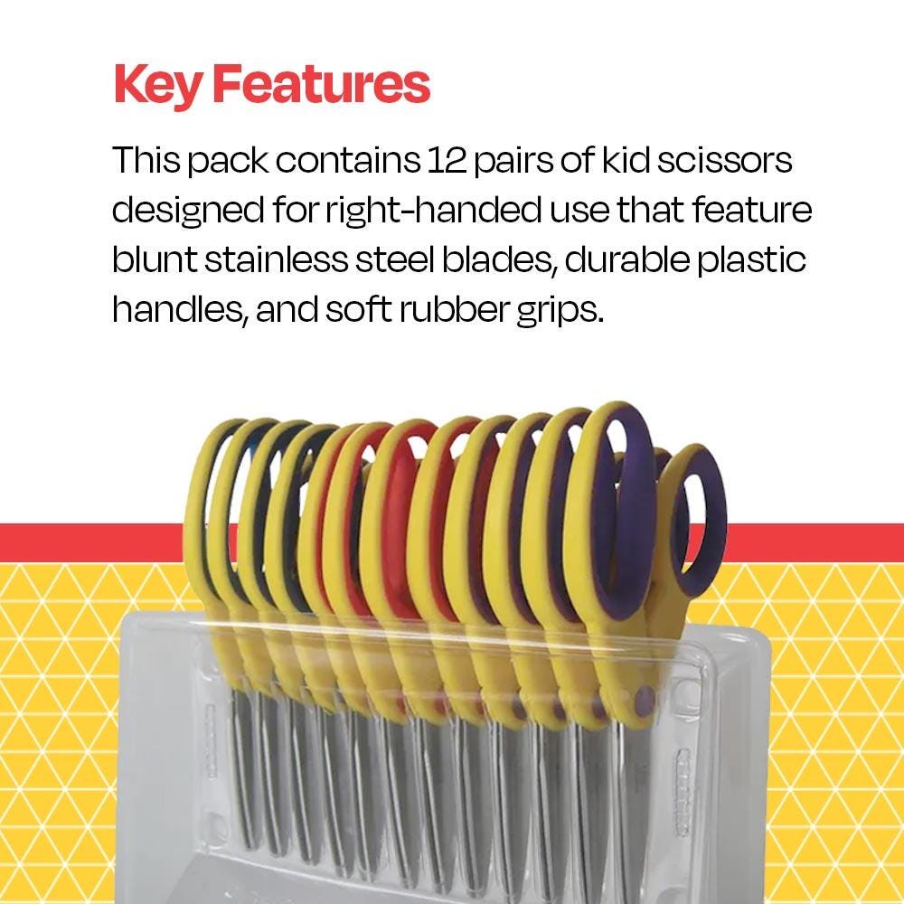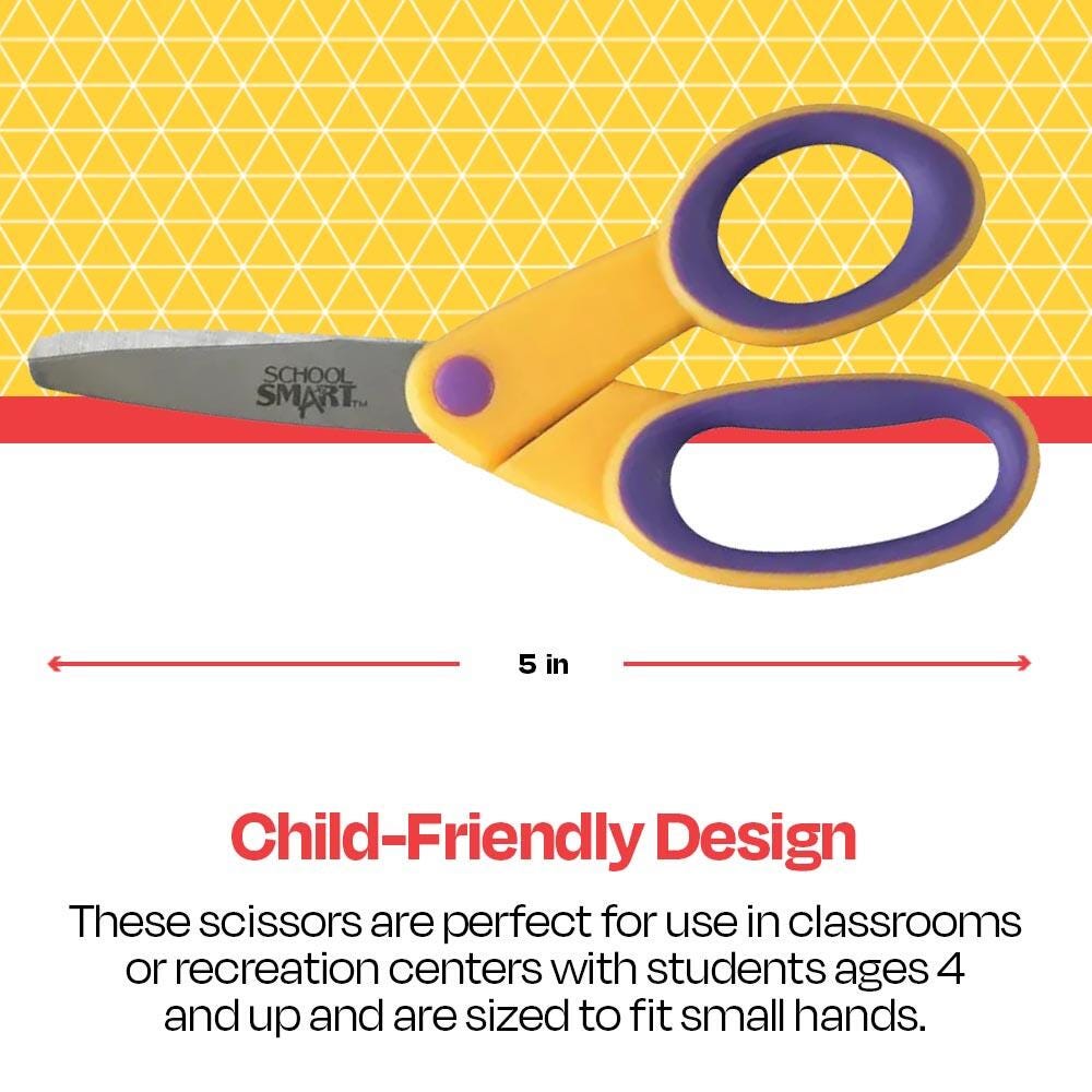The School Smart blunt tip scissors for ages 4+ multi-pack has stainless steel blades molded onto durable plastic handles with soft molded grips. The blunt tips and comfort grip handles help kids cut, craft, and create during art class or playtime at home. Each blunt edge scissor measures 5 inches and the 12-pack comes at an affordable price for schools and recreation centers. Our scissors for kids can be used by righties, and the fun bright colors and high-quality design are perfect for early education and elementary schools.