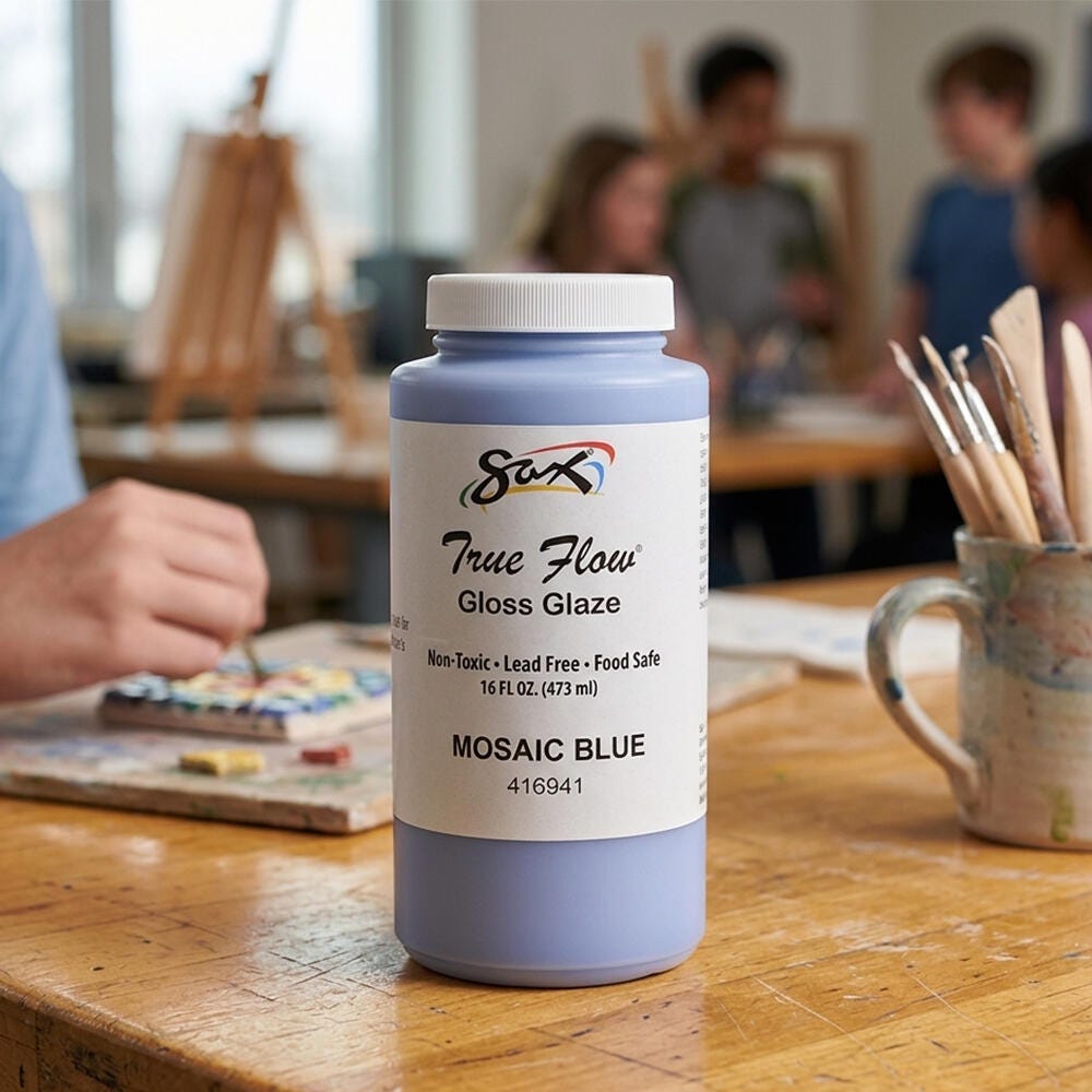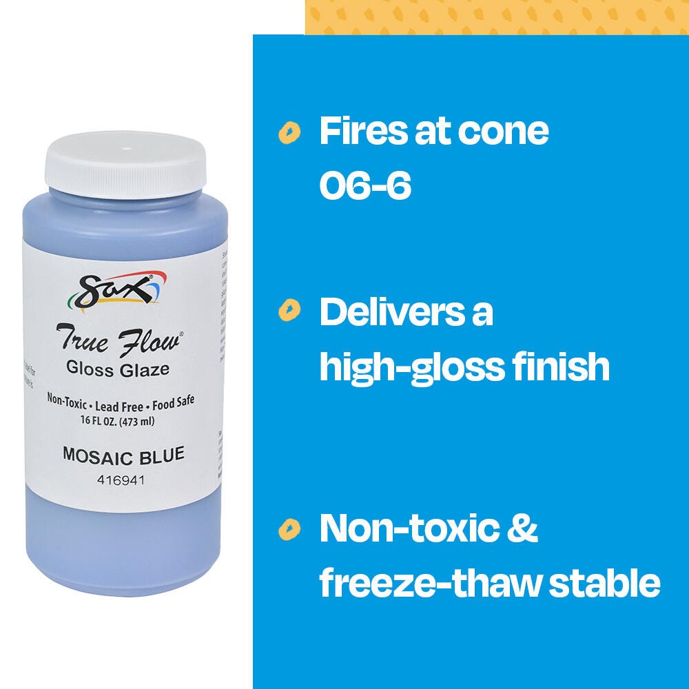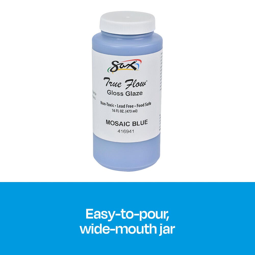 The Sax gloss glaze in opaque Mosaic Blue is a high-quality glazing paint that's dinnerware safe when fired to cone 06-05. During application, the glaze may be a different color and will change to the desired look after the required kiln firing. The color does not change when fired at cone 6.