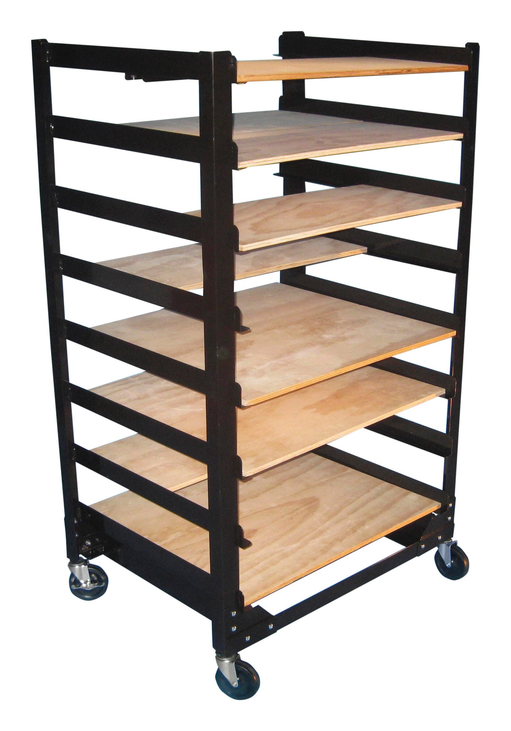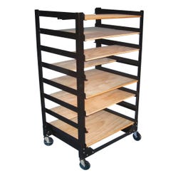 Debcor Ware Truck is dark brown and has a heavy gauge steel construction. 4 in casters are provided for easy mobility and flexibility is provided by 12 plywood half shelves with each of them measuring 12 in x 28 in x 1/2 in. The overall size of the truck is 24 in x 32 in x 54 in and the shelves are placed within 6-1/8 in distance and its distance with the boards is 5-5/8 in.Features