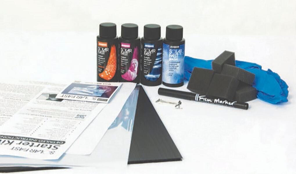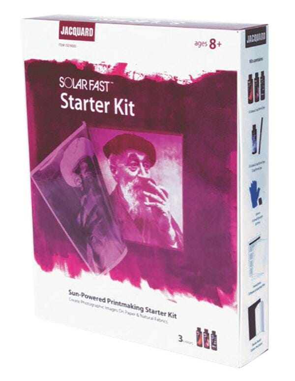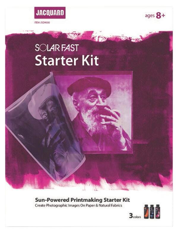 SolarFast Starter Kit offers a great introduction to sun-powered printmaking at a great value. Kit includes everything you need to get started, with enough supplies for up to 8 shirts or several dozen paper prints. (You will need to supply fabric or paper.) Make prints from drawings, photographs, folds, or objects on paper or fabric. Ages 8 and up.Includes: