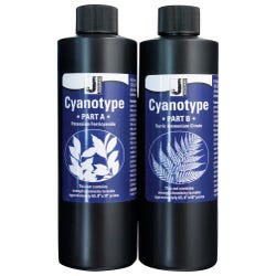 Jacquard's Cyanotype Sensitizer Set makes DIY cyanotype printing as easy as can be. The chemistry comes premeasured in lightproof black bottles. To use, fill each bottle with water to create Stock Solutions A and B, then mix the two in equal parts to create the cyanotype sensitizer. Coat fabric or paper with the sensitizer and, once dry, create prints by exposing to sunlight or UV (3 to 15 minutes, depending on conditions), using objects or a film negative to create an image. After exposure, process prints in a tray of cool water and allow to air dry over about 24 hours; prints will oxidize to their final deep blue color. To instantly oxidize the print to its final color, submerge in a dilute bath of hydrogen peroxide after washing, then rinse and dry. Contains enough chemistry to make approximately 65 prints on 8-1/2 x 11 inch paper or 50 prints on 8-1/2 x 11 inch fabric, depending on the absorbency of the substrate.Includes: