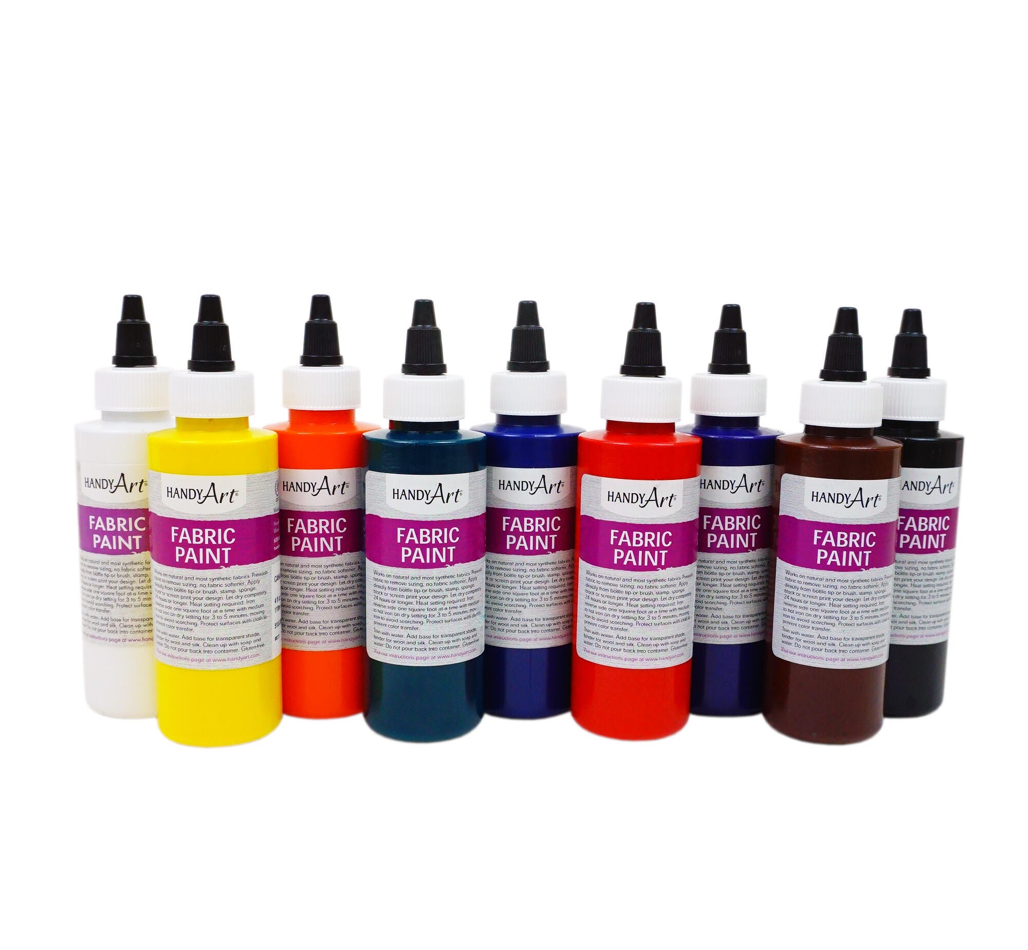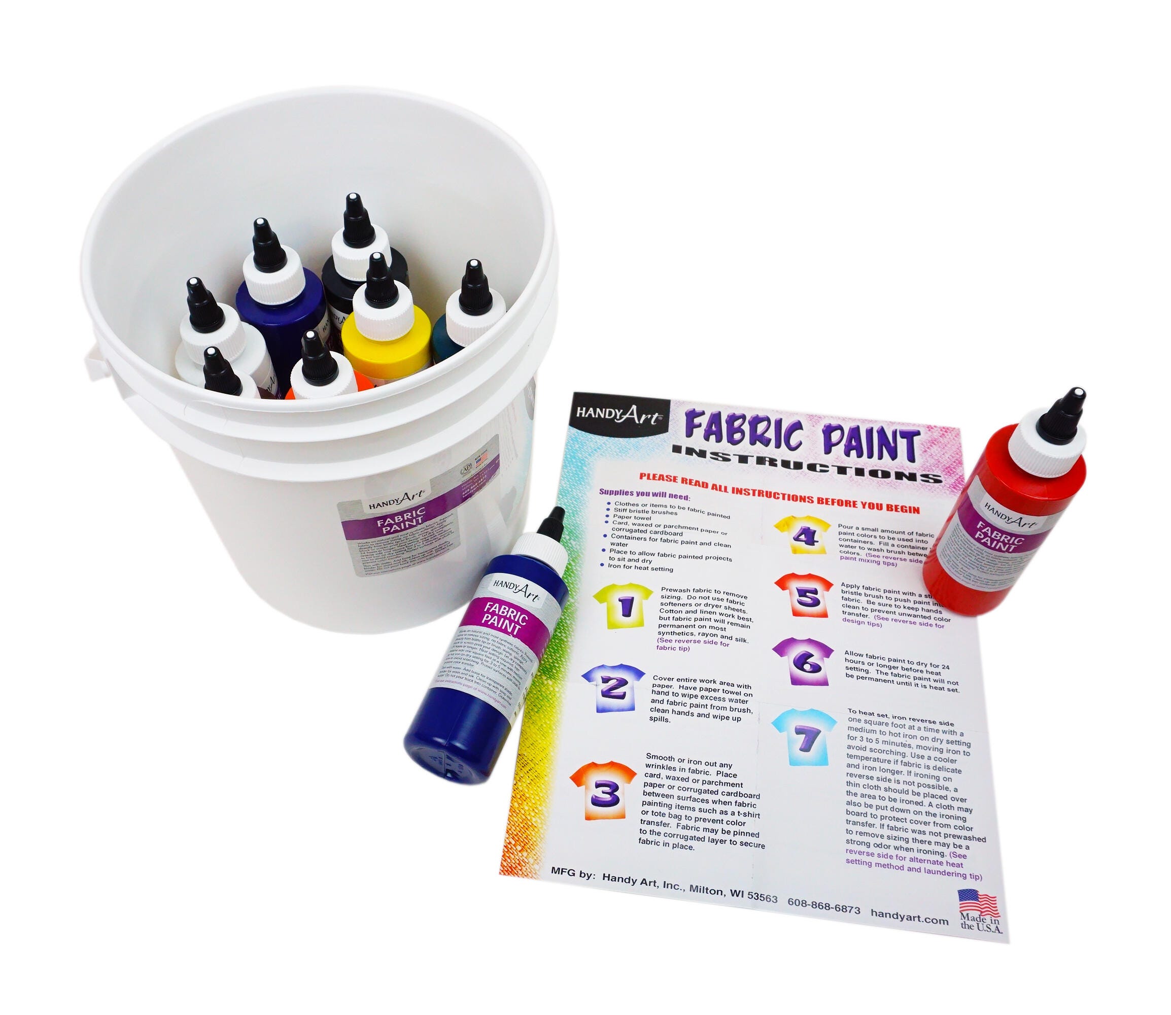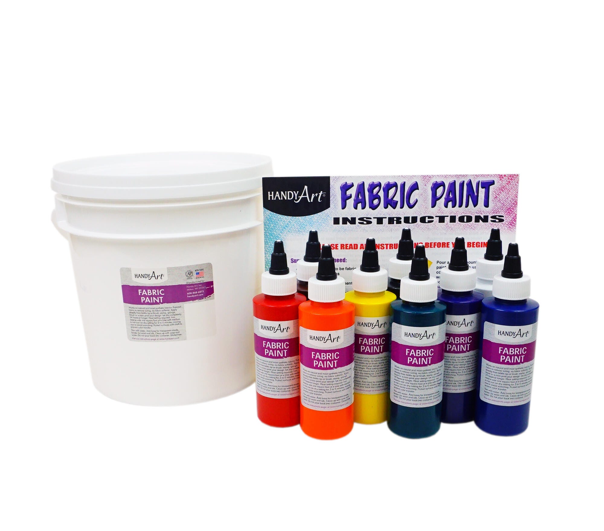 Handy Art Handy Art Fabric Paint Bucket Kit contains colorful assortment of fabric paint that adds excitement to all your fabric projects. Paint comes in 4 ounce bottles and can be used on natural fibers such as cotton and linen. Permanently set colors with an iron. Kit with instructions contains paints in mixing white, canary yellow, chrome orange, forest green, phthalocyanine blue, flag red, violet, chocolate brown and carbon black colors. Set of 9.