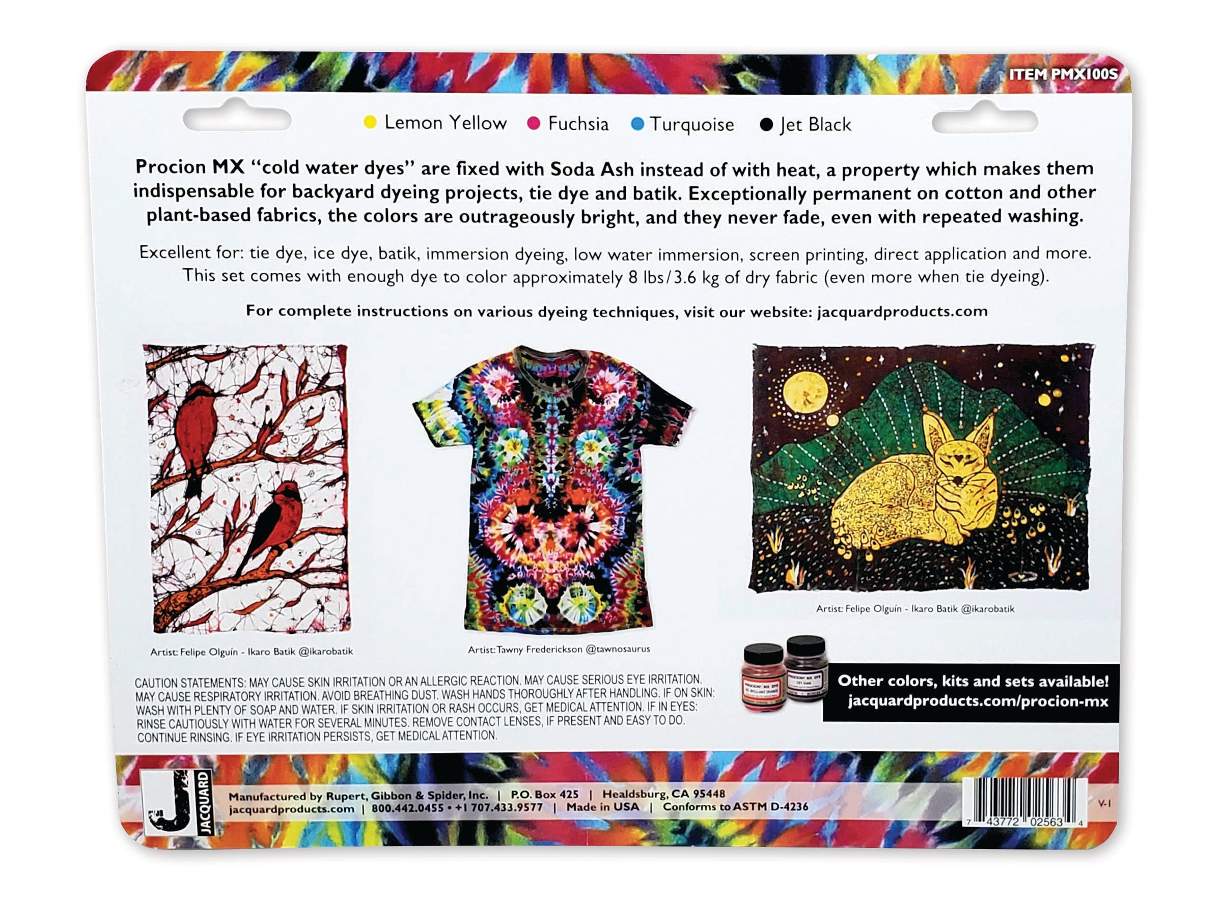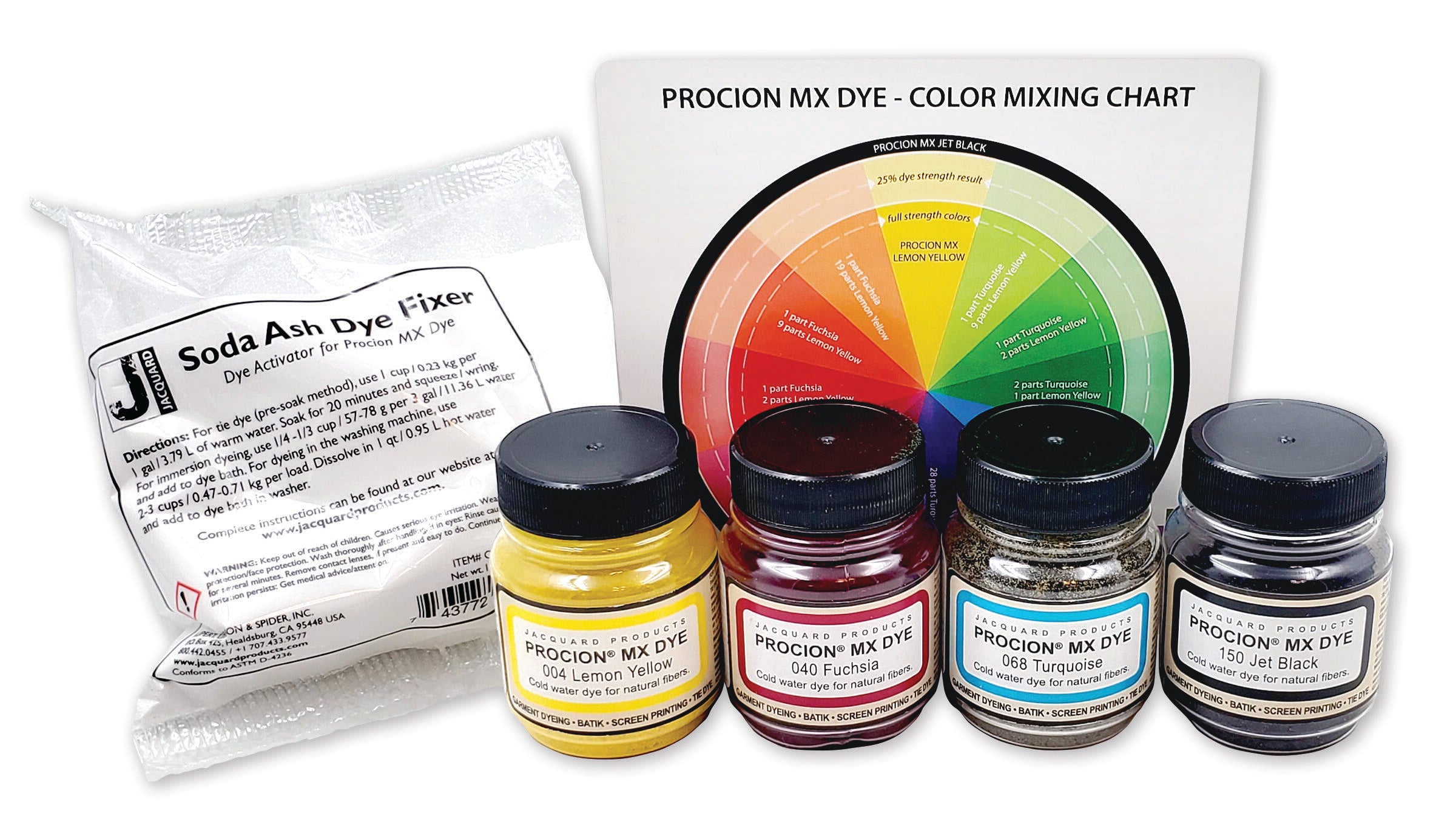 This Procion MX dye kit from Jacquard delivers vibrant and high-quality dyes for tie dye, batik, screen printing, ice dyeing, and more! Procion MX dyes are “cold water dyes” that are fixed chemically instead of with heat, making them easy to use in almost any setting. Procion MX dye is the most permanent and washfast dye, so you get brighter and long-lasting creations. Simply mix the concentrated dye powder with tap water to create the most intense colors possible for cotton, linen, and other plant-based fabrics. This accessible set contains 4 jars (2/3 ounce each) of dye in the colors yellow, fuschia, turquoise, and black, 1 pound of Soda Ash Dye Fixative, and a Color Mixing Chart. One 2/3 ounce jar will dye more than 1 pound of dry fabric.