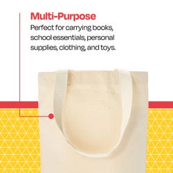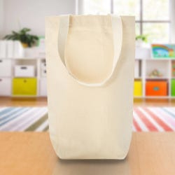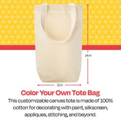 Make a bold fashion statement or just have fun as you color your own tote bags using the School Smart natural tone bag. The canvas tote can be embellished as kids see fit. Young creatives will tote-ally love the option to design their own tote bags or adorn the outside with personalized names, colors, patterns, and prints. Use stencils, stitching, appliques, batik, paint, silkscreen, and more. Your imagination sets the limit as you color your own bag! Each canvas tote bag is made of 100 percent cotton and measures 11 L x 14 W inches, providing plenty of room for books, toys, clothing, and more. Use the plain canvas tote bag for projects at home, school, or parties. Great for all ages.Features