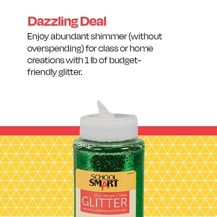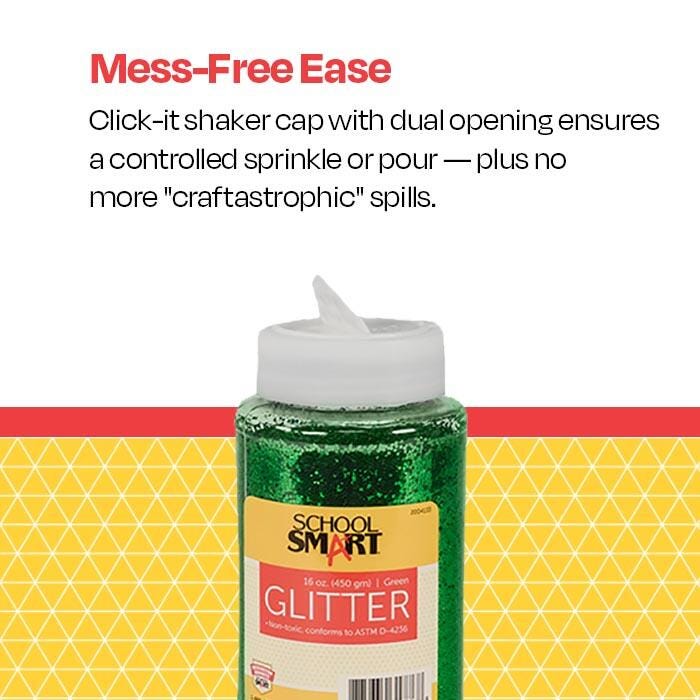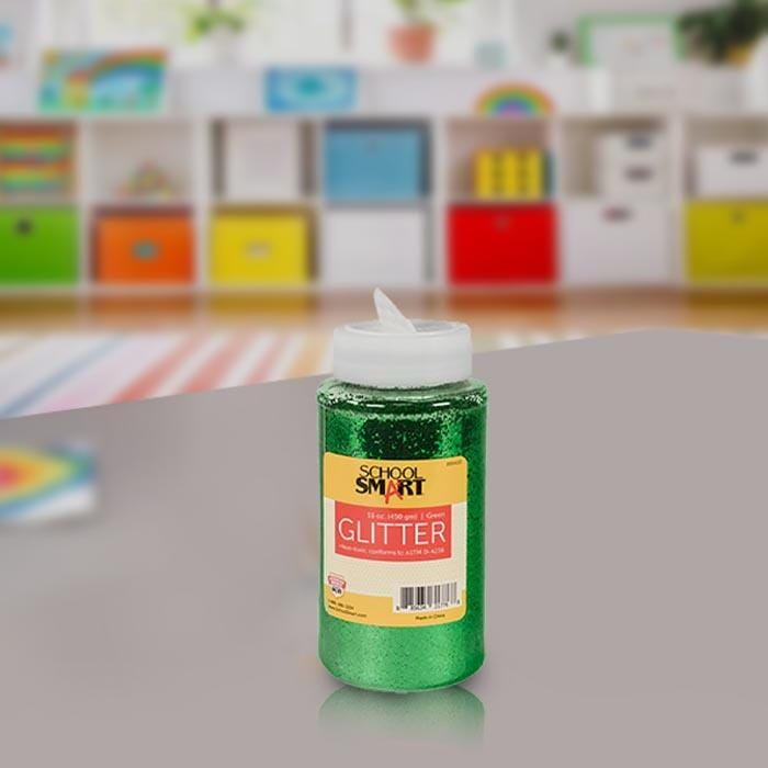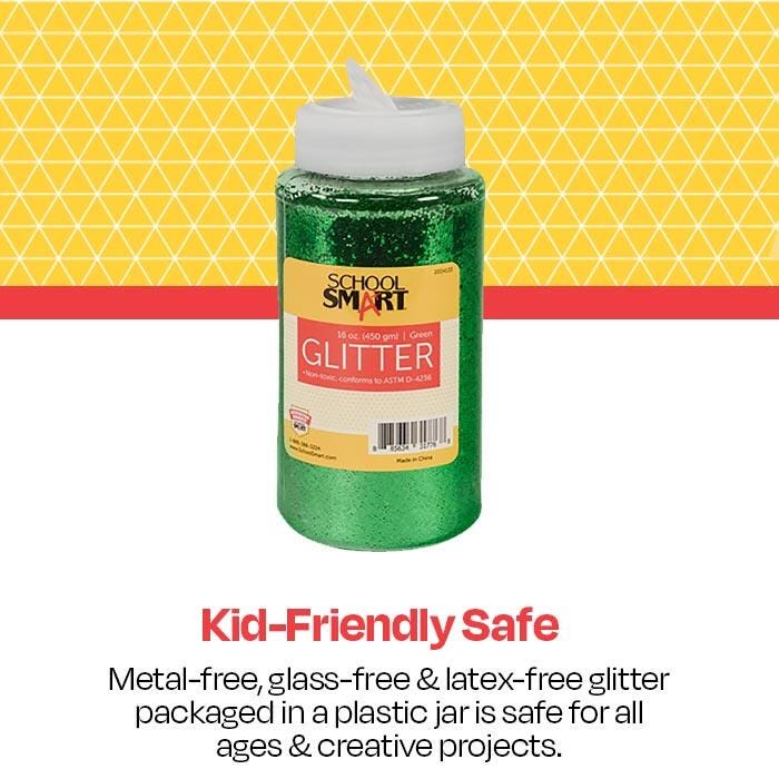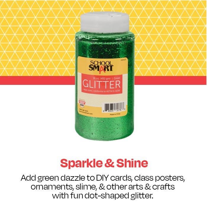School Smart Green Craft Glitter is made with tiny shimmering flakes that add sparkle to candles, displays, craft projects, costumes, artwork, or any party. It is easy to use by just spraying or brushing adhesives on a surface and then sprinkling colorful glitter from the handy shaker container to make attractive craft projects. Glitter is non-toxic and perfect to use for cards, ornaments, candles, collages, and much more. The container features a click-it, shaker cap to help prevent a "craftastrophe" (You know the type). 1 pound jar of green glitter.