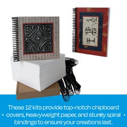 Students can sketch, write, and design with this innovative, all-in-one Spiral Bookmaking Kit from Sax! This kit contains all the materials you need to make 12 chipboard-covered, spiral-bound books with 50 white (80 lb weight basis) paper sheets inside for sketching and writing. The inside and outside of journals can be embellished with nearly any medium, including gel markers, paint, mosaics, specialty paper, and glitter glue. The kit can serve as a great introduction to free-form writing, gratitude journals, writing a "first book," quiet time activities, planners, and more at home or in the classroom. The binding coils are black. The pages and covers measure 5 x 7 inches.