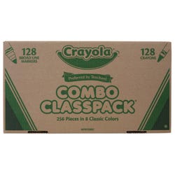 Doodle, draw, and color away with this impressive Markers & Crayons Classpack. Crayola delivers quality tools in this conveniently large pack that is perfect to share in large groups, classrooms, summer camp groups, and beyond. Plus, the convenient flip-top box keeps everything organized for easy storage and transport. This pack includes 128 crayons and 128 Broad Line Markers, for a set of 256 high-quality art tools. There are 16 crayons and 16 markers in each of the following colors: red, orange, yellow, green, blue, violet, black, and brown.Features