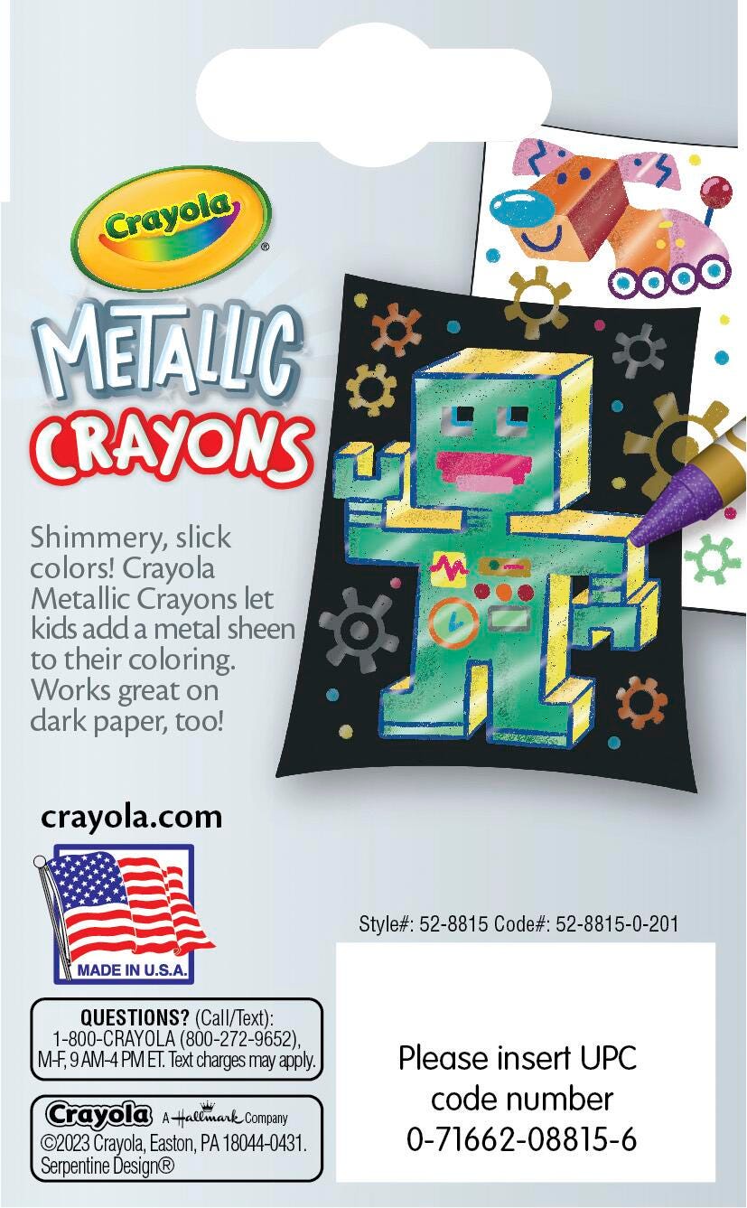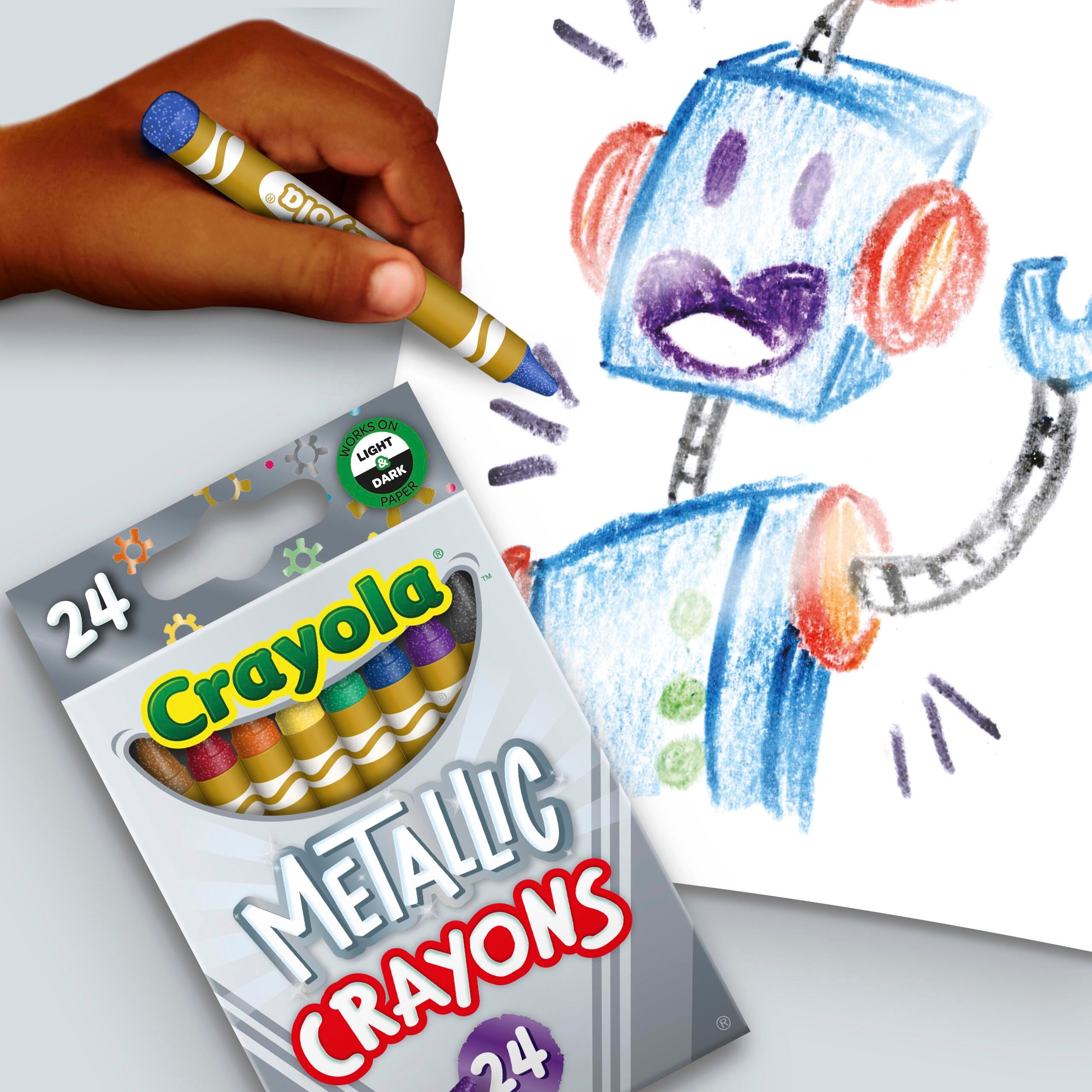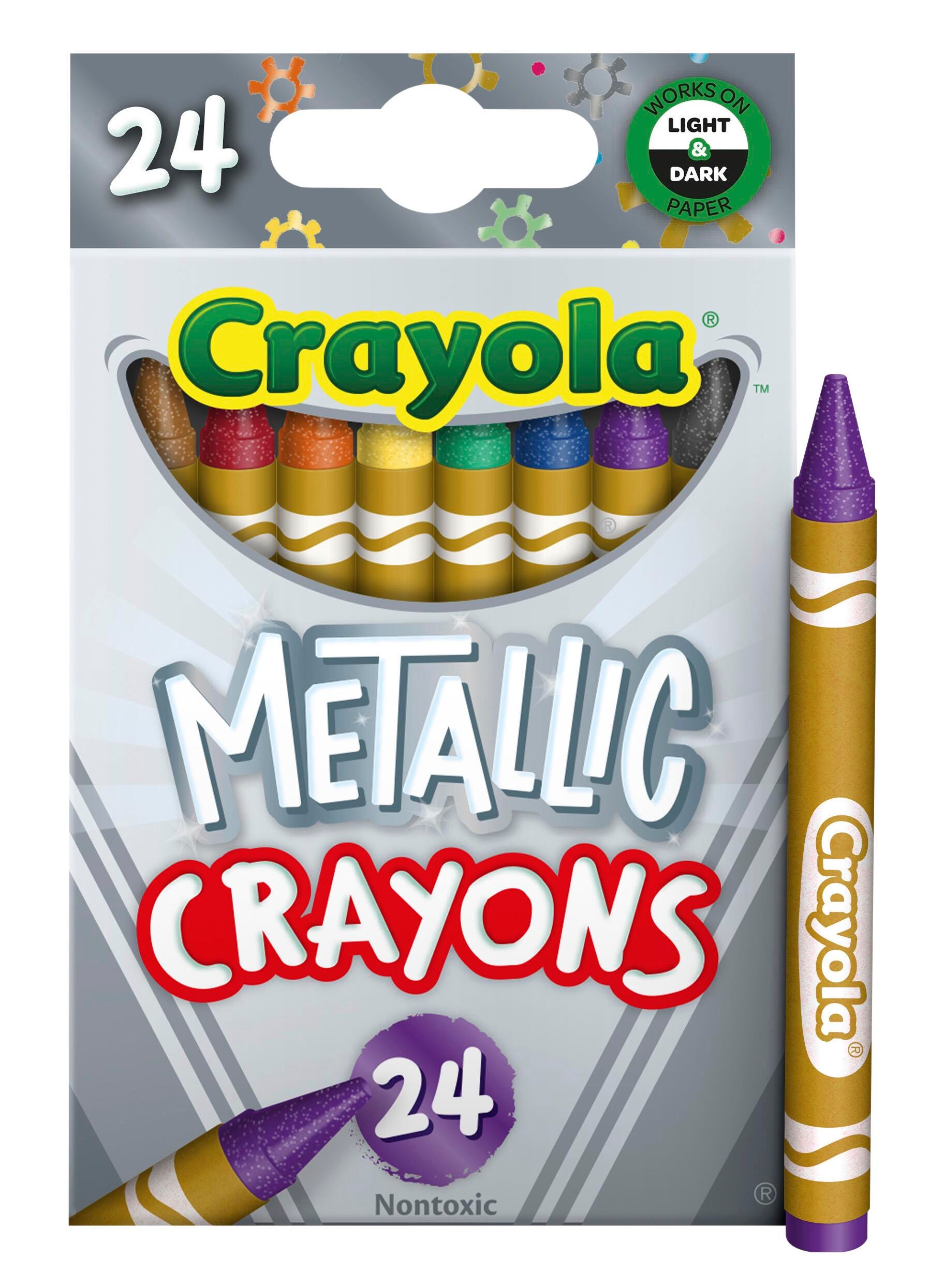 Crayola Metallic Crayons help make craft and coloring projects shine! The wax formula lays down smooth, shimmering lines that pop on both light and dark paper. These glimmering colors add another dimension of fun to creative activities and make the perfect addition to any crayon collection. This set contains 24 crayons in an assorment of colors.Features