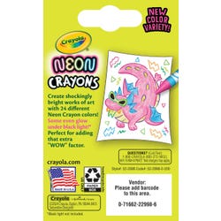 Light up your artwork with this pack of Crayola Neon Crayons, where every color is a burst of fun waiting to happen. These crayons help young artists bring any fluorescent fantasy to life, especially under a blacklight. Ideal for every mini Monet, these Crayola Crayons are a must-have for lively school assignments and dynamic playtime at home and are built to deliver hours of fun without breaking. This set contains 24 crayons in an assortment of colors.