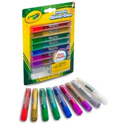 Crayola Glitter Glue squeezes out easily and dries in 30 minutes, so kids can make their artwork shimmer anytime. Washable Glitter Glue rinses off from skin and most machine-washable clothing. Non-Toxic. Sold as a pack of 9 assorted colors. Each tube is 0.35 ounces.Features