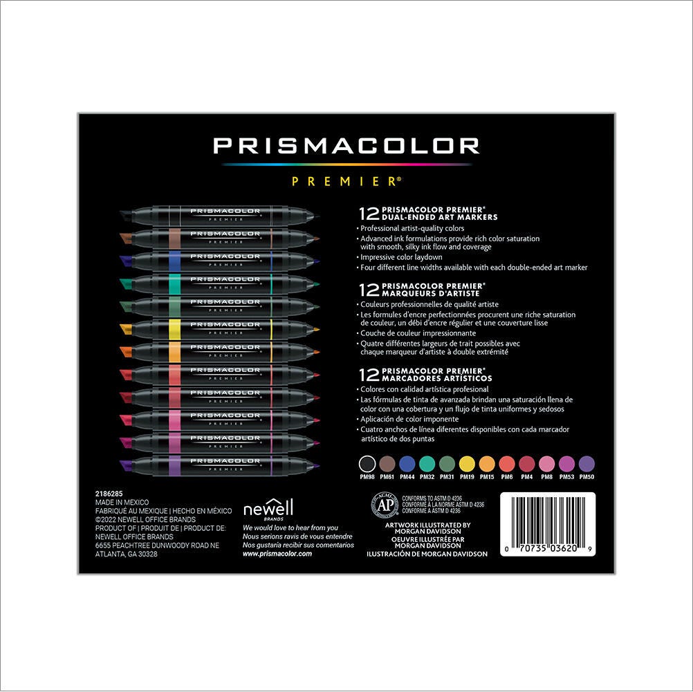The Premier® Dual-Ended Art Markers from Prismacolor offer a versatile and high-quality tool for any artist. Each marker features a dual-ended design that delivers a fine tip on one end and a broad chisel tip on the other, so you can create with four line widths from one marker. The set offers a range of vibrant colors and richly saturated ink for smooth lines and even coverage. Both tips share ink from the same reservoir to ensure consistent color for every stroke. This set contains 12 dual-tipped markers.