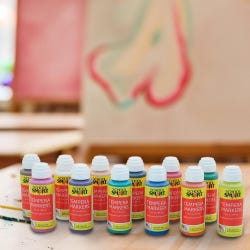 School Smart tempera paint daubers come in refillable plastic squeeze bottles. Each dauber has a 2 ounce capacity. Our non-toxic, water-soluble tempera poster markers feature a 3/8 inch dauber applicator tip for a non-messy and smooth application. This poster paint marker set includes 12 daubers. The paint daubers are freeze/thaw stable.Features