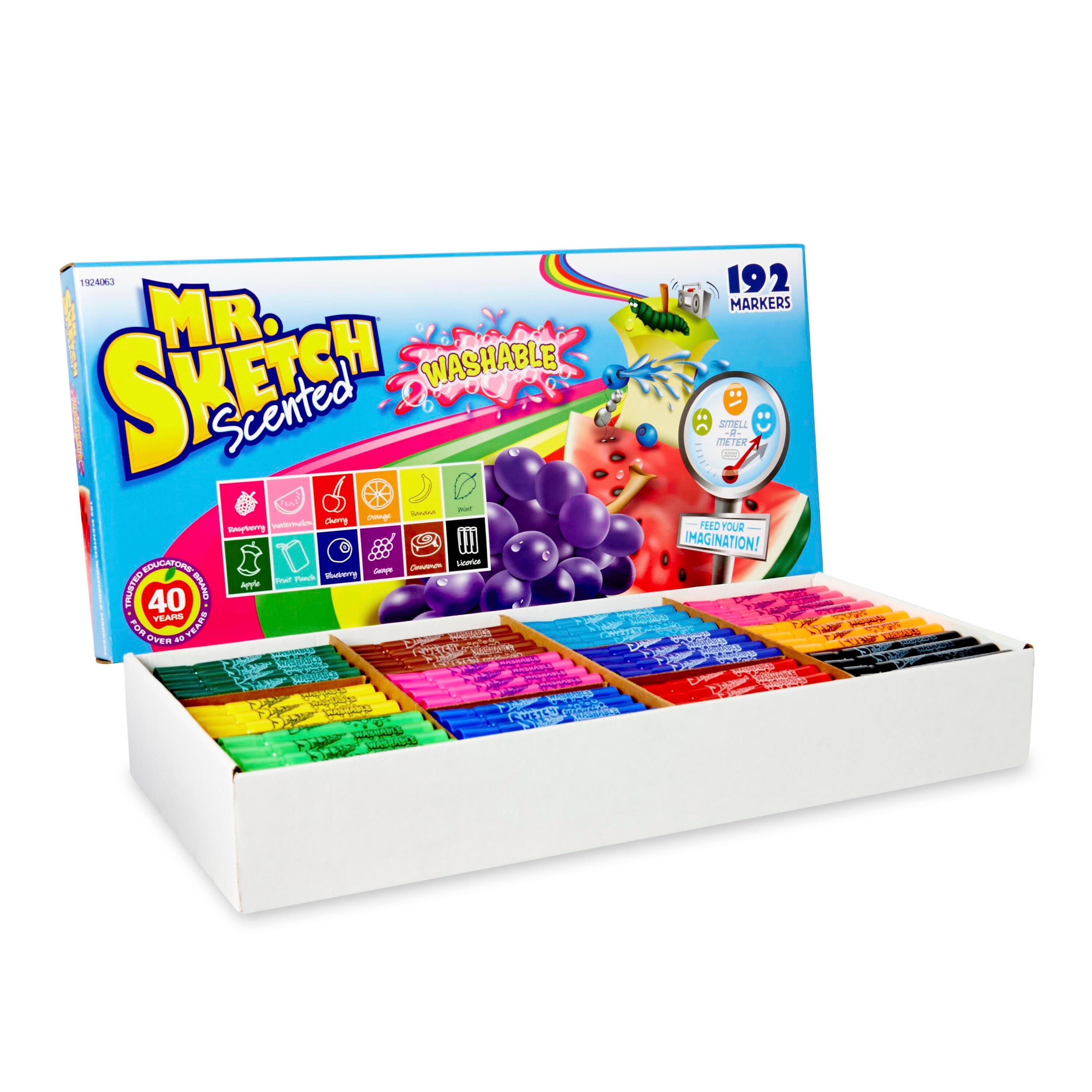 Mr. Sketch Scented Washable Markers are available in fun core scents to spark young artists' imagination and unleash creativity. These bright, vivid colors have a chisel tip that easily creates three different line widths. Set of 192 includes 16 each of the following colors: Magenta (Raspberry), Pink (Watermelon), Red (Cherry), Orange (Orange), Yellow (Banana), Green (Mint), Dark Green (Apple), Turquoise (Fruit Punch), Blue (Blueberry), Purple (Grape), Brown (Cinnamon), and Black (Licorice).