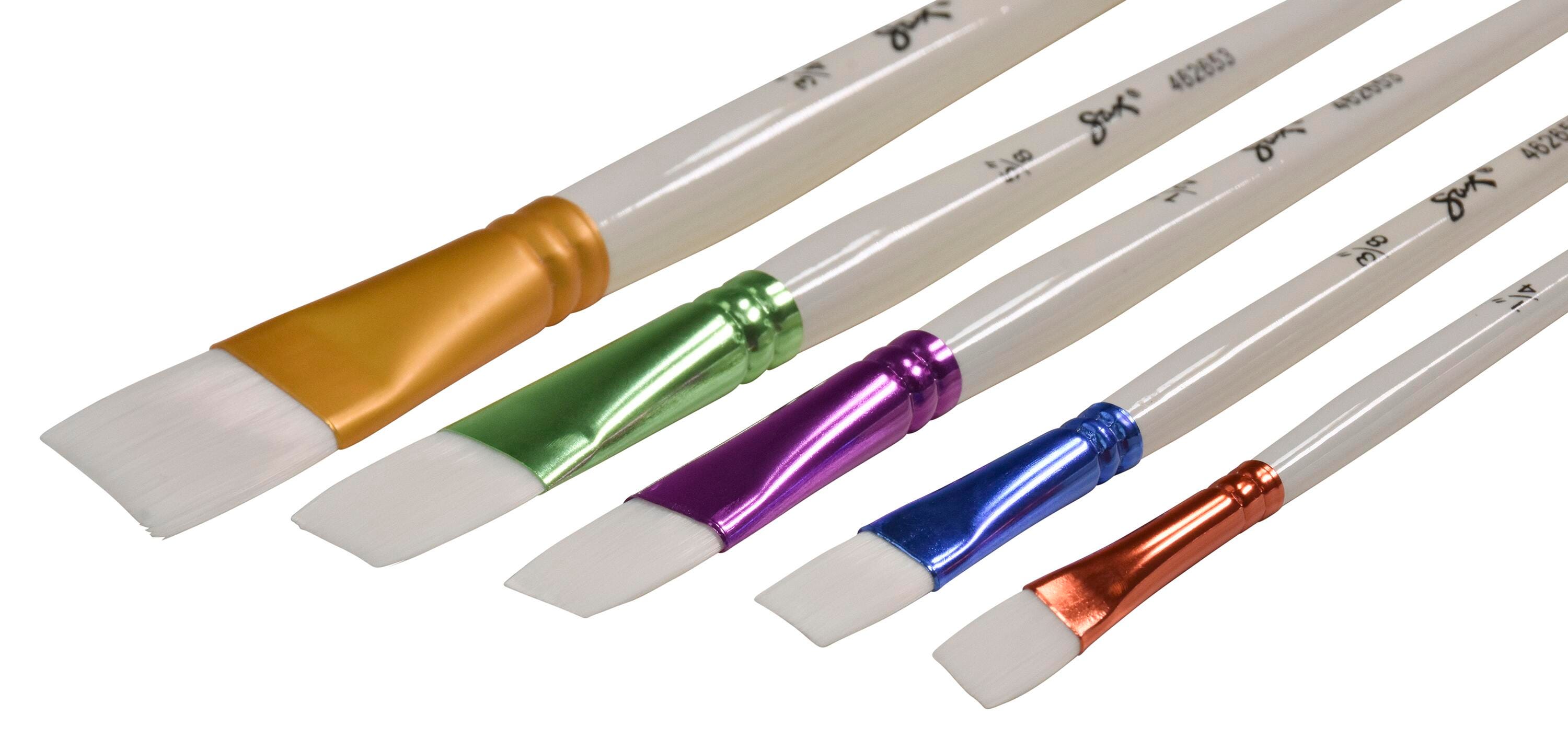 Sax spectrum flat watercolor paint brushes come in assorted sizes and colored ferrules for easy selection. Our brushes are handcrafted with high-quality, natural materials and designed to withstand different types of projects. Each hardwood lacquered handle is painted glossy white for a sleek look and includes colored anodized aluminum ferrules. Get predictable brush strokes every time with great color capacity, crisp edges, and sharp points on our high-quality brushes.Features