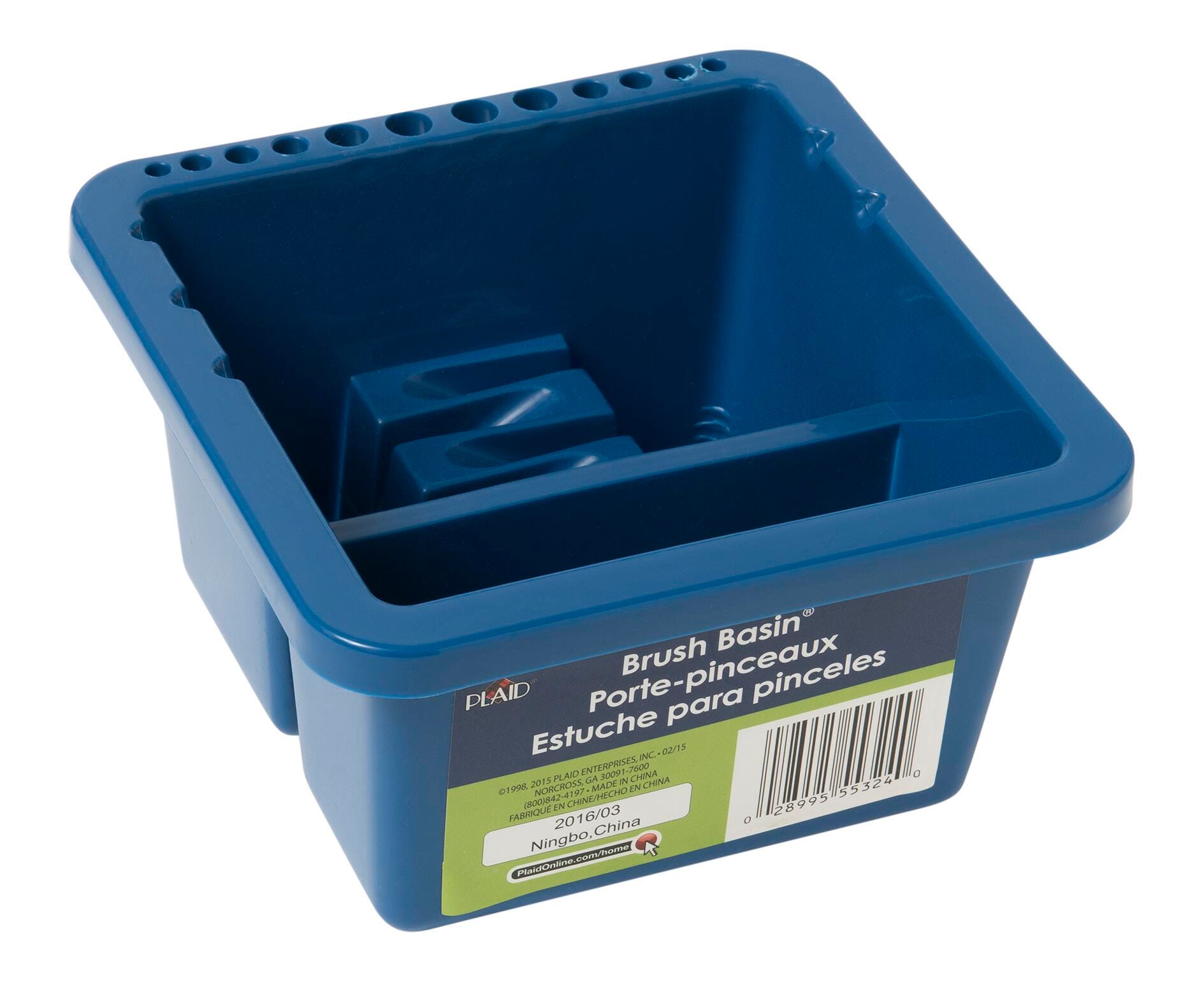 Plaid Enterprises Brush Basin measuring 6-1/2 x 3-1/2 inches holds up to 12 brushes of different sizes. Hi-density polypropylene basin is resistant to water, oil and lacquer-based solvents. Easy to clean basin features 2 separate wells, one with ridges on bottom to scrub bristles clean and the other with 5 molded brush holders to keep brushes suspended. Dark blue.Features