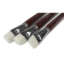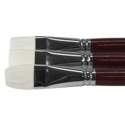Sax white taklon paint brushes with long handles and bright tips (size 12) provide superb color holding, spring, sharp edges, and smooth application. Optimal brush strokes help students create their best projects while enhancing their painting techniques on different mediums. Our 3-pack of bright synthetic bristle brushes is great for dabbing, impressions, and controlled strokes. The flat brush is perfect for the classroom or art studio. Use the white nylon synthetic hair brushes with oil and acrylic.Features