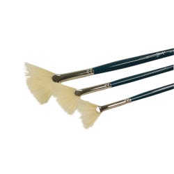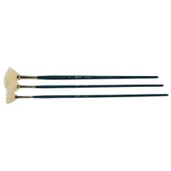 Like a feather, these Sax Hog Bristle Fan Blends wisp color or makeup like a breeze across the page or face. Tops are pure white with thin-edged fan shape. Long lacquered handles in an eye-catching turquoise are topped with nickel-plated seamless brass ferrules. Even the smallest, finest blender can be used effectively with oils and acrylics. Set of 3 makes it perfect for every painting or contouring need.Features