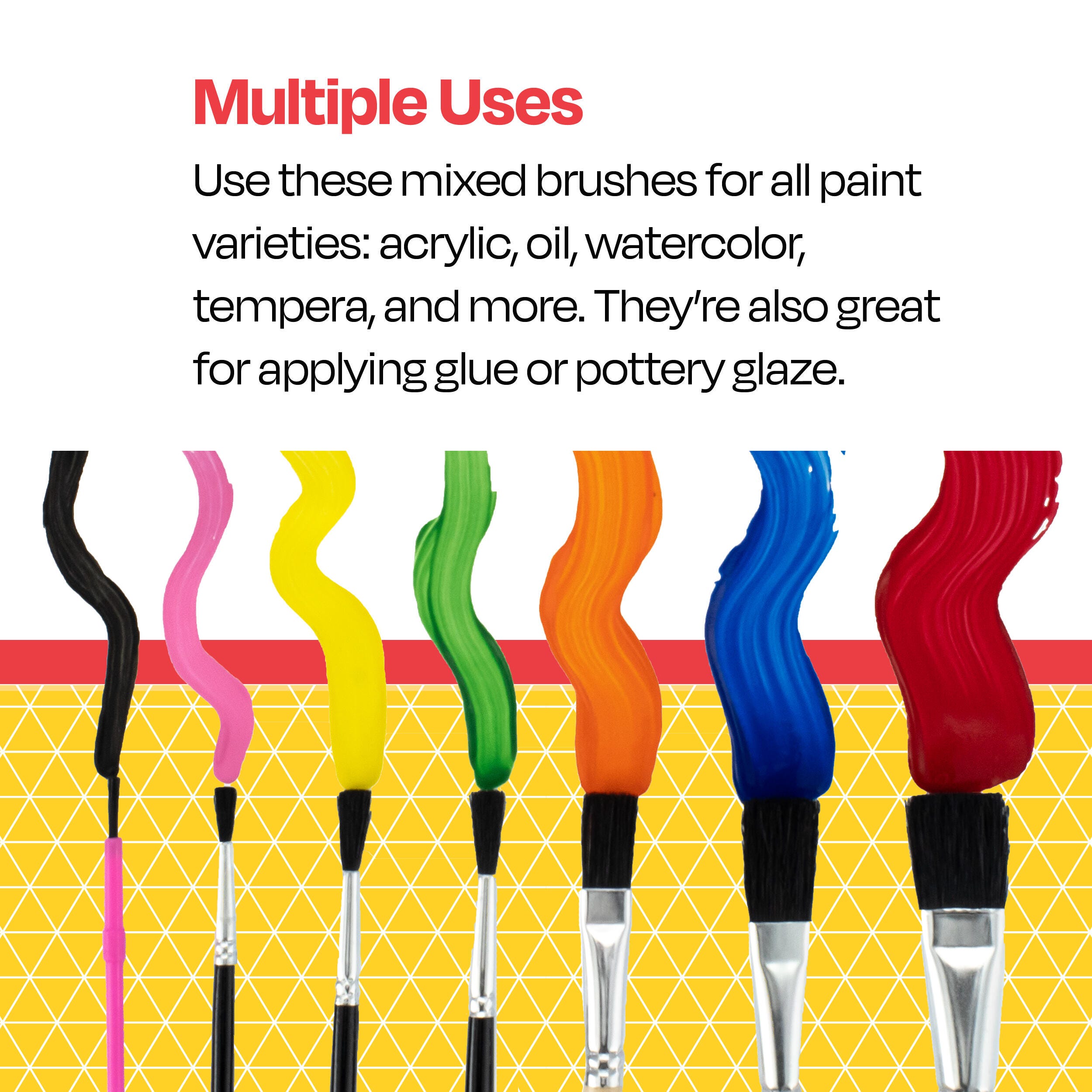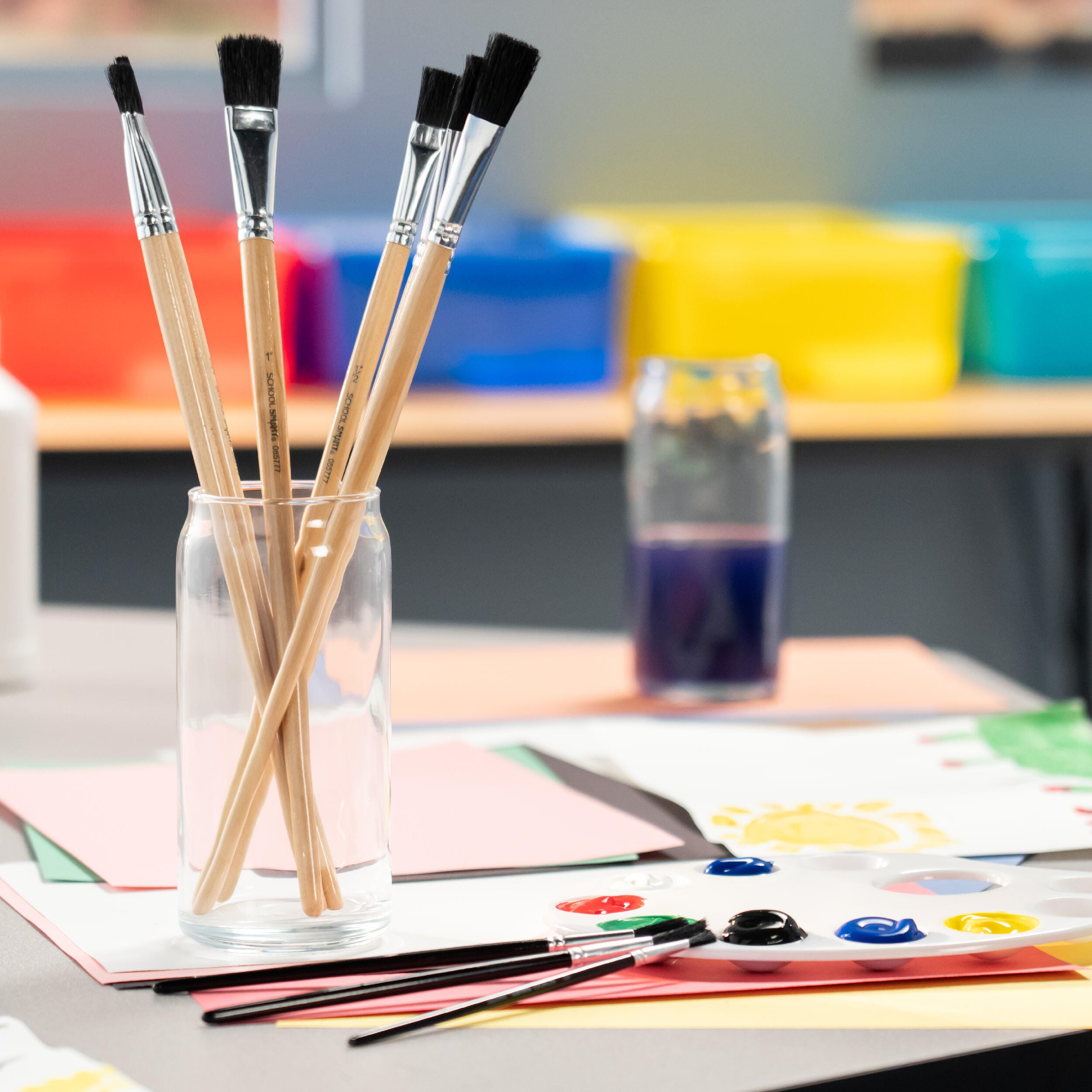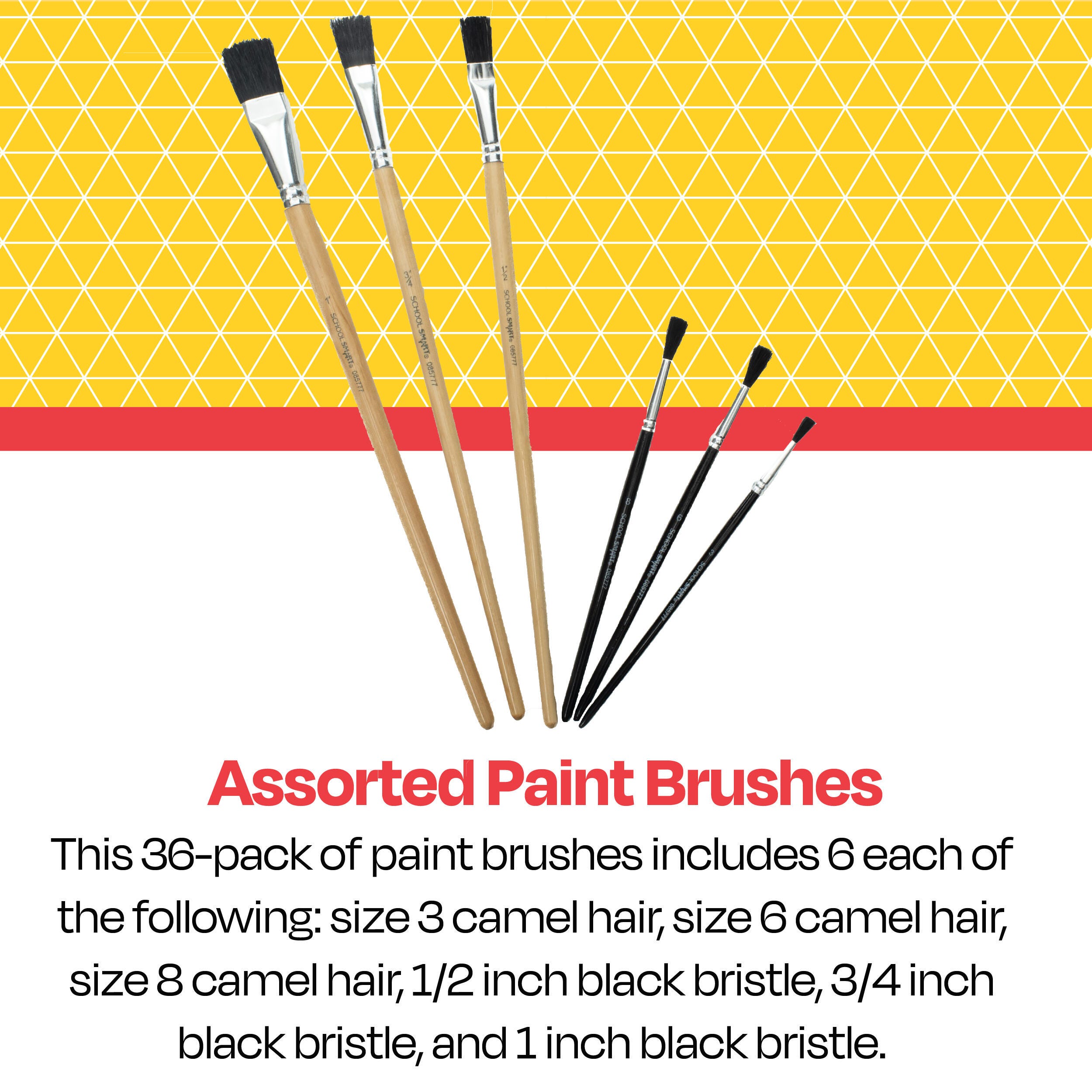 Stock up for art class with the School Smart intermediate mixed paint brush set featuring different painting tools. Our set of brushes is designed for a variety of paint types and a full range of media, including acrylics, tempera, and watercolors. The long-handled wooden brushes feature seamless ferrules and have camel hair or black bristles, and give students more freedom to create.