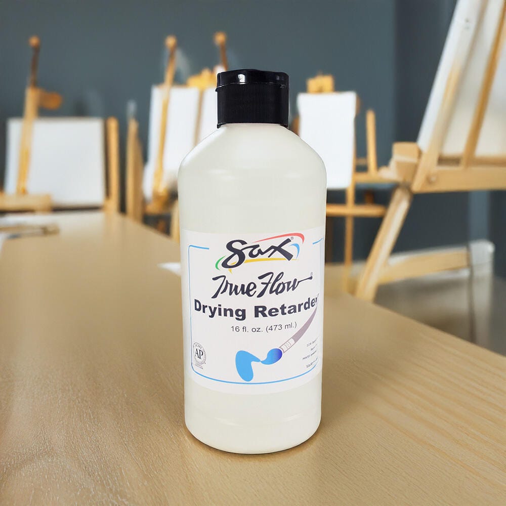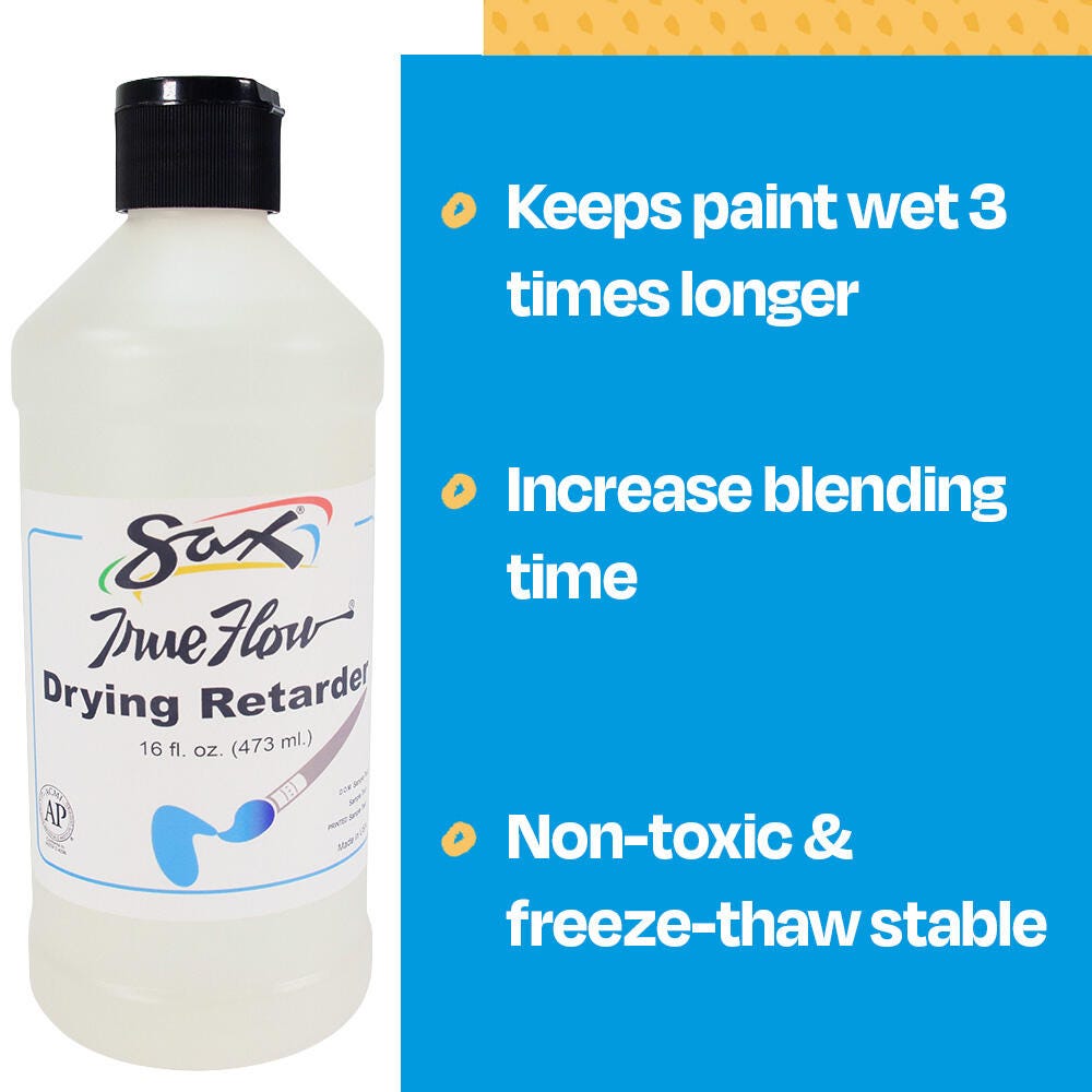 Slow down the paint drying process with Sax acrylic drying retarder. The slow dry formula helps you create your best art projects by keeping paints wet and workable for up to 3 times longer. It’s easy to use and a little goes a long way. Drizzle the clear solution directly into your acrylics, onto your base coat, or add with water to a spray bottle for misting over the canvas and palette before starting paintwork. This will help break the surface and instantly allow for smooth brush strokes. Our paint retarder will not alter the colors of acrylics or other mediums.Features