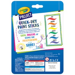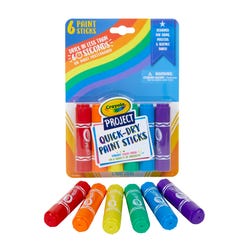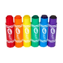 Crayola Project Paint Sticks help keep craft time simple. This set is a perfect less-mess solution for any paint or craft project big or small. These Project Paint Sticks feature a child-friendly formula that dries quickly and is simple to clean up. The sticks are easy for little hands to hold and deliver smooth laydown with consistent coverage. This set includes 6 paint sticks, 1 each in the following colors: red, orange, yellow, green, blue, and purple.Features