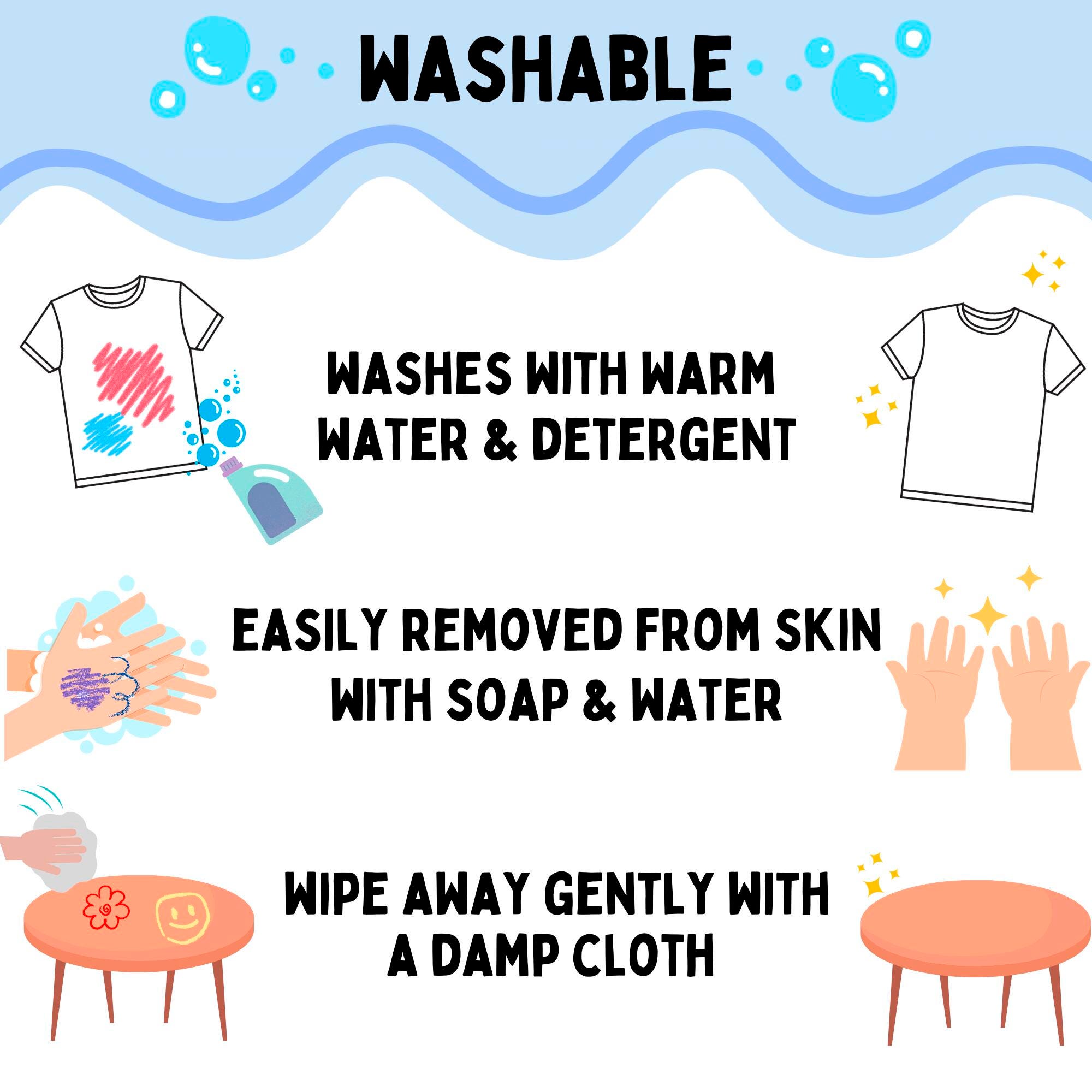 Wash easily from hands, clothes, and surfaces, making cleanup a breeze after every creative session