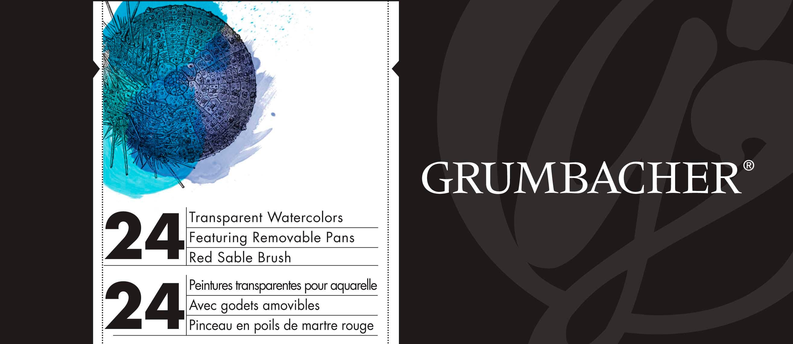 Grumbacher Watercolor Paint Set comes with round red sable brush. Set features full-circular pans of Non-Toxic watercolors that instantly release strong washes of dazzling color. Transparent Watercolor Paint Set offers maximum brilliance and pure color intensity with fine milled pigments. Set contains 24 assorted watercolors.