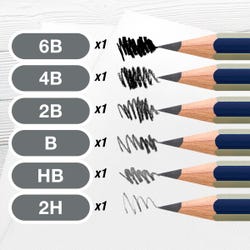 Faber-Castell Creative Studio Goldfaber Graphite Sketch Pencils are made from reforested wood. The hexagonal shape and have enameled wood casings. Graphite smoothly lays down rich, dark color and offer a good variation of blackness between degrees. Set of 6 includes one each in grades 2H, HB, B, 2B, 4B, 6B placed in a beautiful hinged-lid tin. Non-toxic; AP-certified.