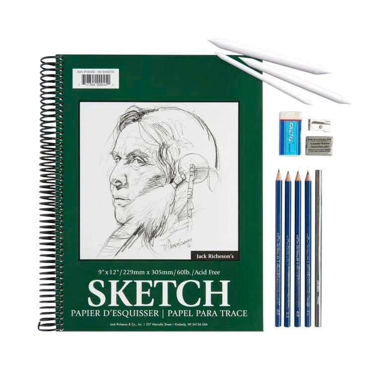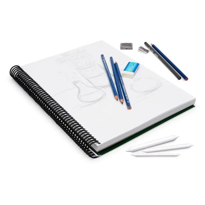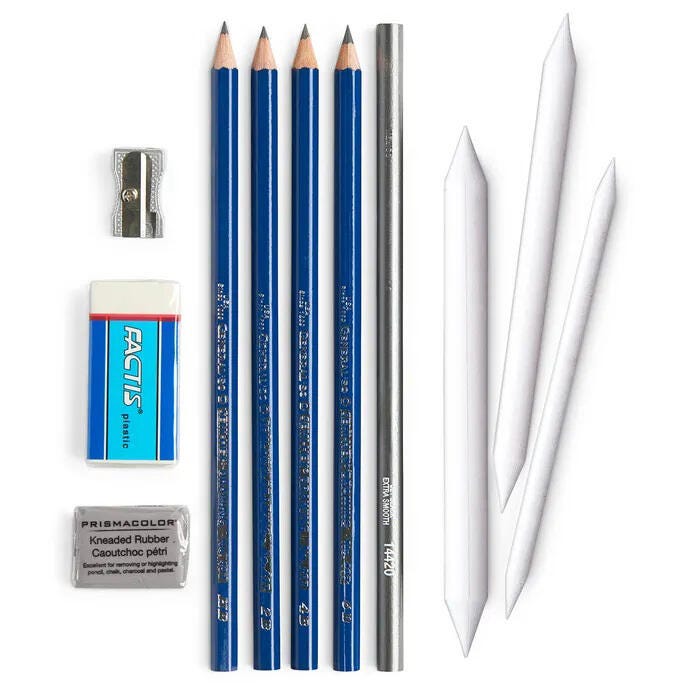 Created in collaboration with an art teacher, the Nasco Student Drawing Set, gives young artists the essential tools to build strong drawing skills. The set supports shading, line work, blending, and value studies, and includes a durable sketchbook and storage bag to keep materials organized for classroom, home, or independent practice. This set includes: Prismacolor® kneaded eraser, Factis® plastic eraser, Prismacolor® Ebony 6B pencil, four Nasco/Generals® drafting pencils (6B, 4B, 2B, HB), metal single‑hole sharpener, Jack Richeson® 9 inch x 12 inch, 100‑sheet sketchbook, three blending stumps (1/4 inch, 3/8 inch, 1/2 inch), compact storage bag.Features